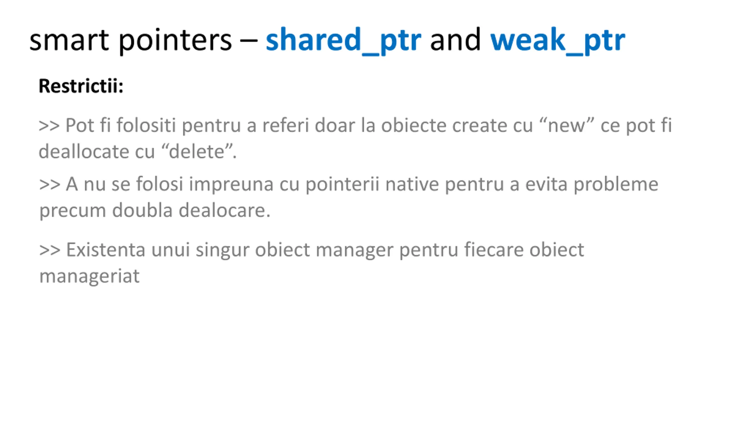 smart pointers shared_ptr and weak_ptr Restrictii: >> Pot fi folositi pentru a referi doar la obiecte create cu new ce pot fi deallocate cu delete . >> A nu se folosi impreuna cu pointerii native pentru a evita probleme precum doubla dealocare. >> Existenta unui singur obiect manager pentru fiecare obiect manageriat