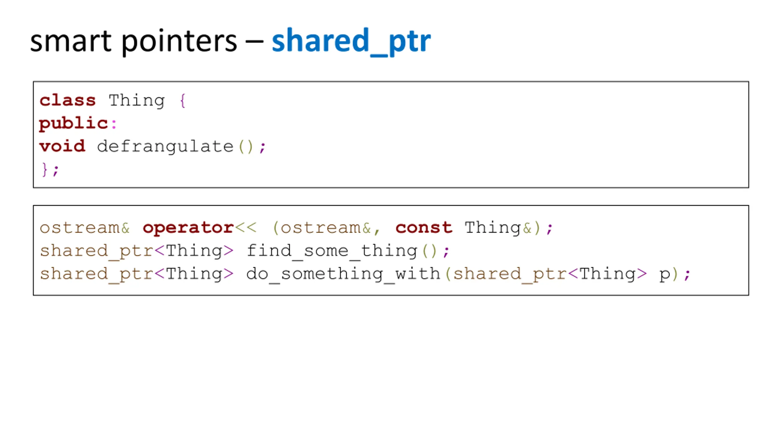 smart pointers shared_ptr class Thing { public: void defrangulate(); }; ostream& operator<< (ostream&, const Thing&); shared_ptr<Thing> find_some_thing(); shared_ptr<Thing> do_something_with(shared_ptr<Thing> p);