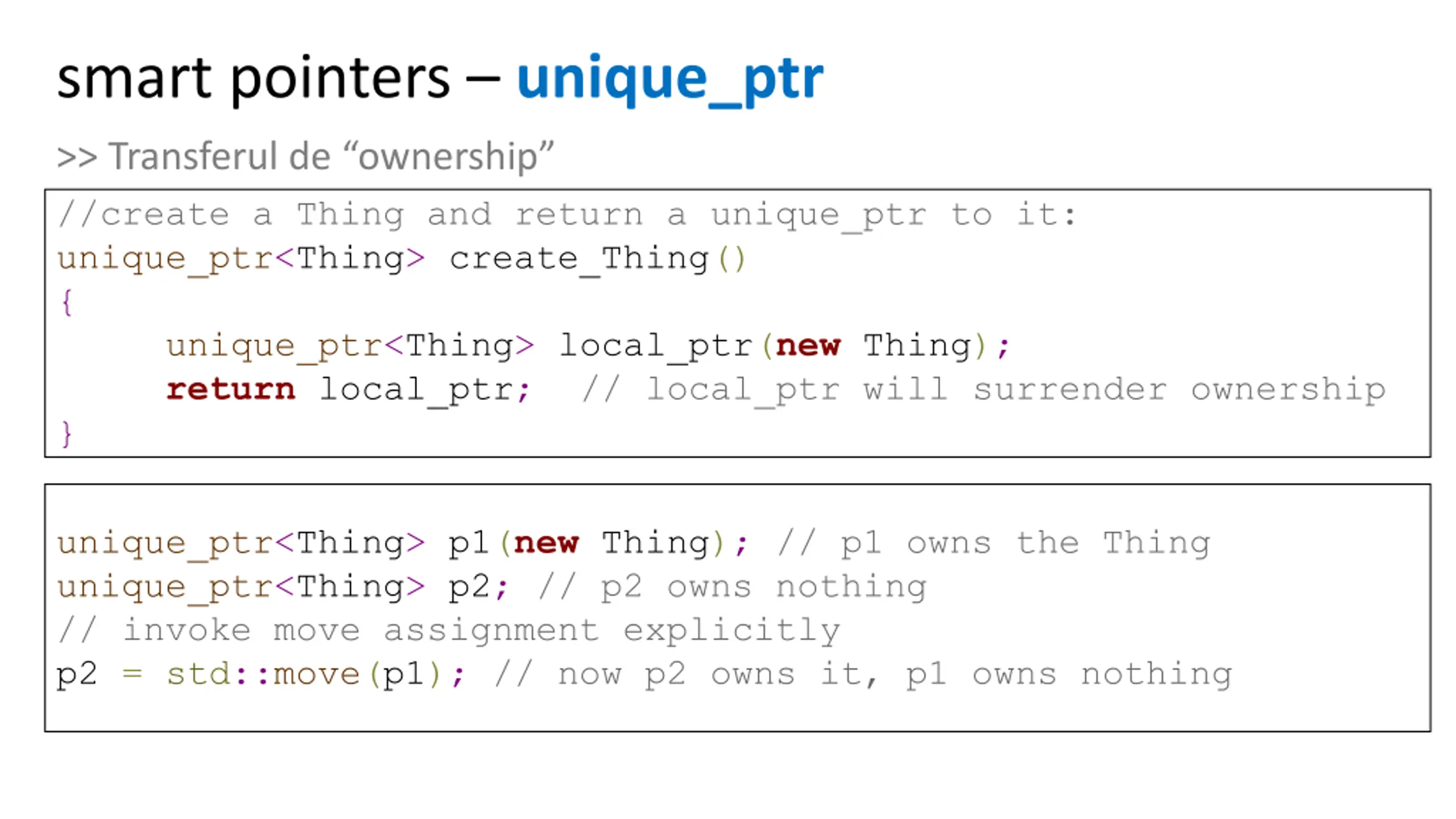 smart pointers unique_ptr >> Transferul de ownership //create a Thing and return a unique_ptr to it: unique_ptr<Thing> create_Thing() { unique_ptr<Thing> local_ptr(new Thing); return local_ptr; // local_ptr will surrender ownership } unique_ptr<Thing> p1(new Thing); // p1 owns the Thing unique_ptr<Thing> p2; // p2 owns nothing // invoke move assignment explicitly p2 = std::move(p1); // now p2 owns it, p1 owns nothing