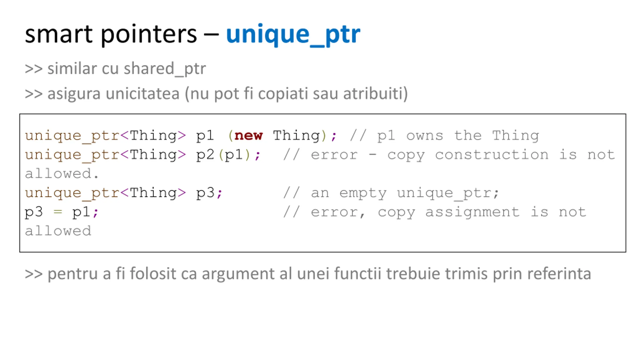 smart pointers unique_ptr >> similar cu shared_ptr >> asigura unicitatea (nu pot fi copiati sau atribuiti) unique_ptr<Thing> p1 (new Thing); // p1 owns the Thing unique_ptr<Thing> p2(p1); // error - copy construction is not allowed. unique_ptr<Thing> p3; // an empty unique_ptr; p3 = p1; // error, copy assignment is not allowed >> pentru a fi folosit ca argument al unei functii trebuie trimis prin referinta
