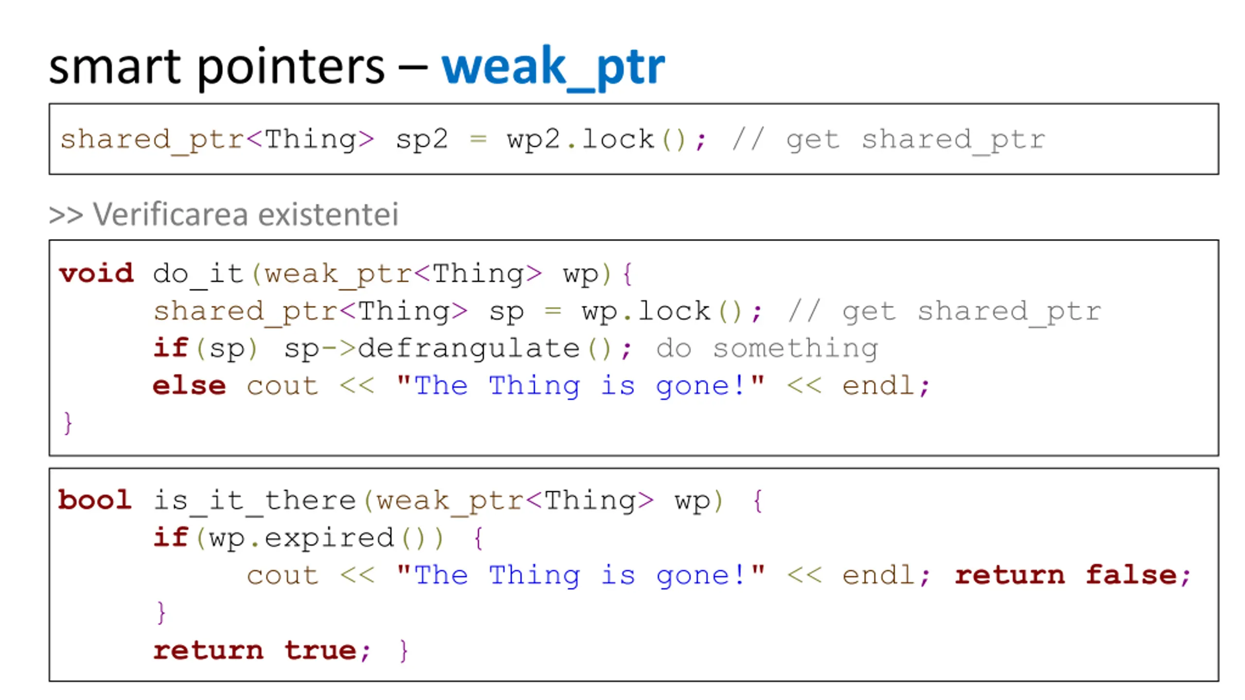 smart pointers weak_ptr shared_ptr<Thing> sp2 = wp2.lock(); // get shared_ptr >> Verificarea existentei void do_it(weak_ptr<Thing> wp){ shared_ptr<Thing> sp = wp.lock(); // get shared_ptr if(sp) sp->defrangulate(); do something else cout << "The Thing is gone!" << endl; } bool is_it_there(weak_ptr<Thing> wp) { if(wp.expired()) { cout << "The Thing is gone!" << endl; returnfalse; } returntrue; }