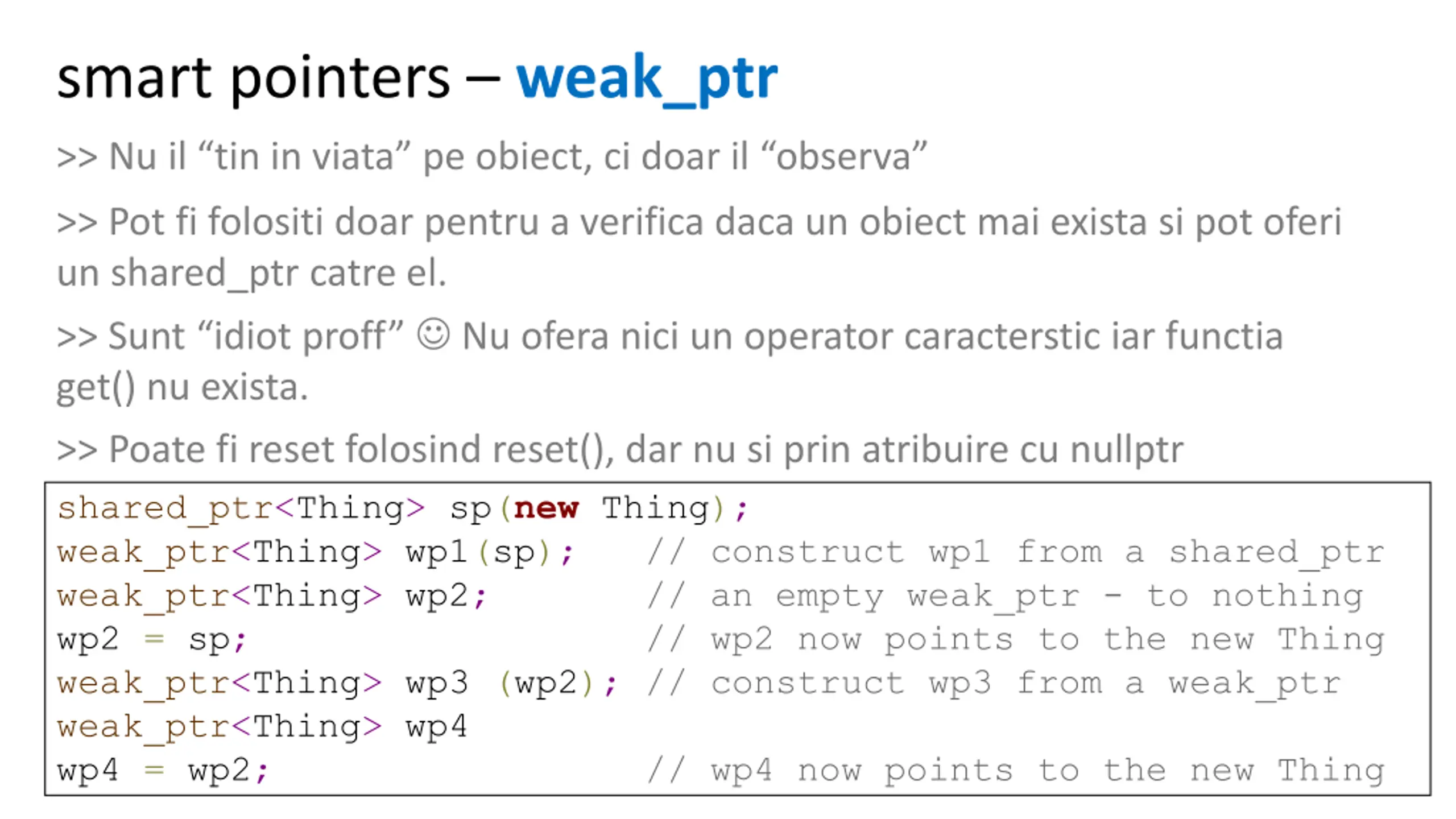 smart pointers weak_ptr >> Nu il tin in viata pe obiect, ci doar il observa >> Pot fi folositi doar pentru a verifica daca un obiect mai exista si pot oferi un shared_ptr catre el. >> Sunt idiot proff Nu ofera nici un operator caracterstic iar functia get() nu exista. >> Poate fi reset folosind reset(), dar nu si prin atribuire cu nullptr shared_ptr<Thing> sp(new Thing); weak_ptr<Thing> wp1(sp); // construct wp1 from a shared_ptr weak_ptr<Thing> wp2; // an empty weak_ptr - to nothing wp2 = sp; // wp2 now points to the new Thing weak_ptr<Thing> wp3 (wp2); // construct wp3 from a weak_ptr weak_ptr<Thing> wp4 wp4 = wp2; // wp4 now points to the new Thing