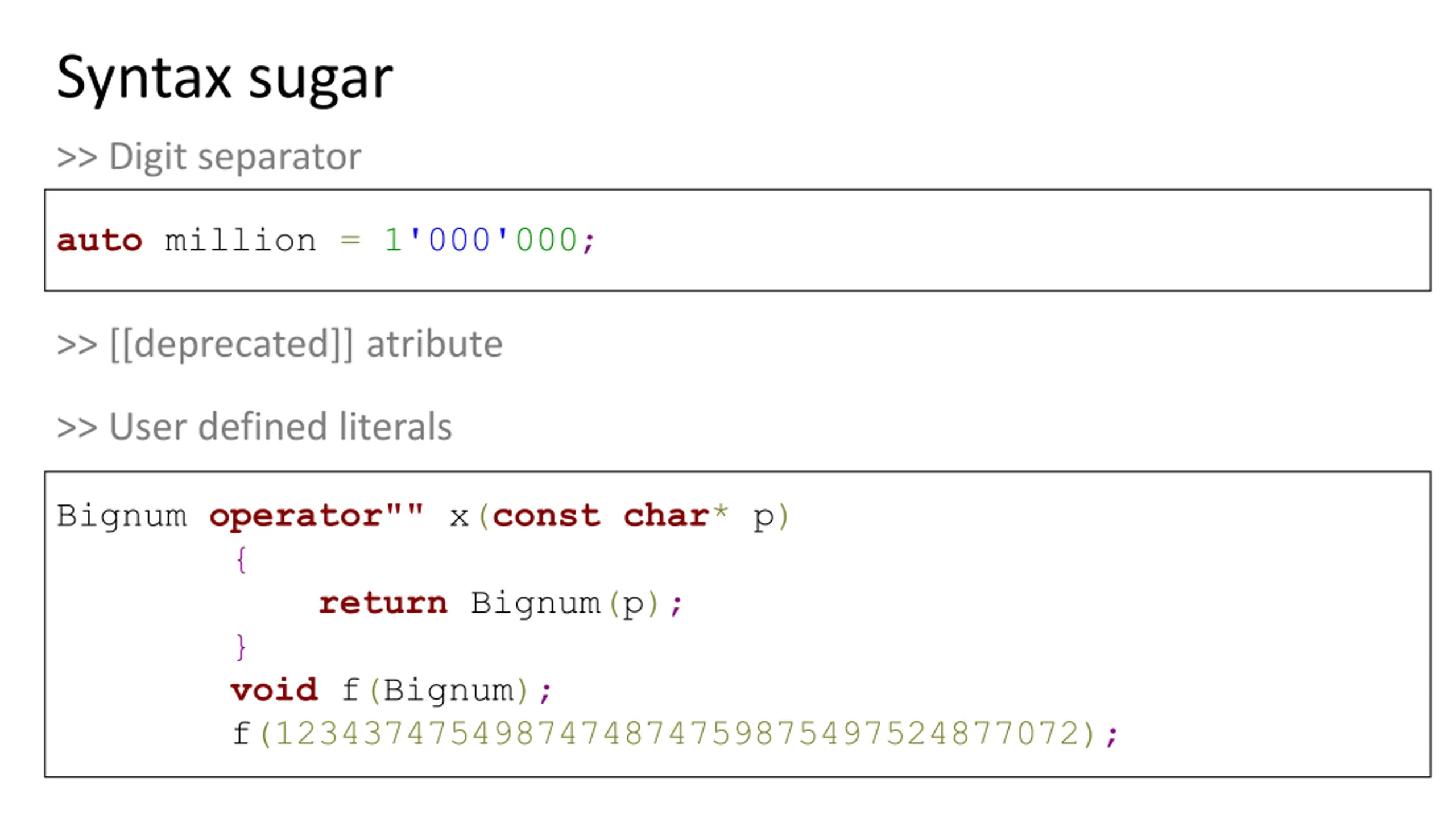 Syntax sugar >> Digit separator auto million = 1'000'000; >> [[deprecated]] atribute >> User defined literals Bignum operator"" x(constchar* p) { return Bignum(p); } void f(Bignum); f(1234374754987474874759875497524877072);