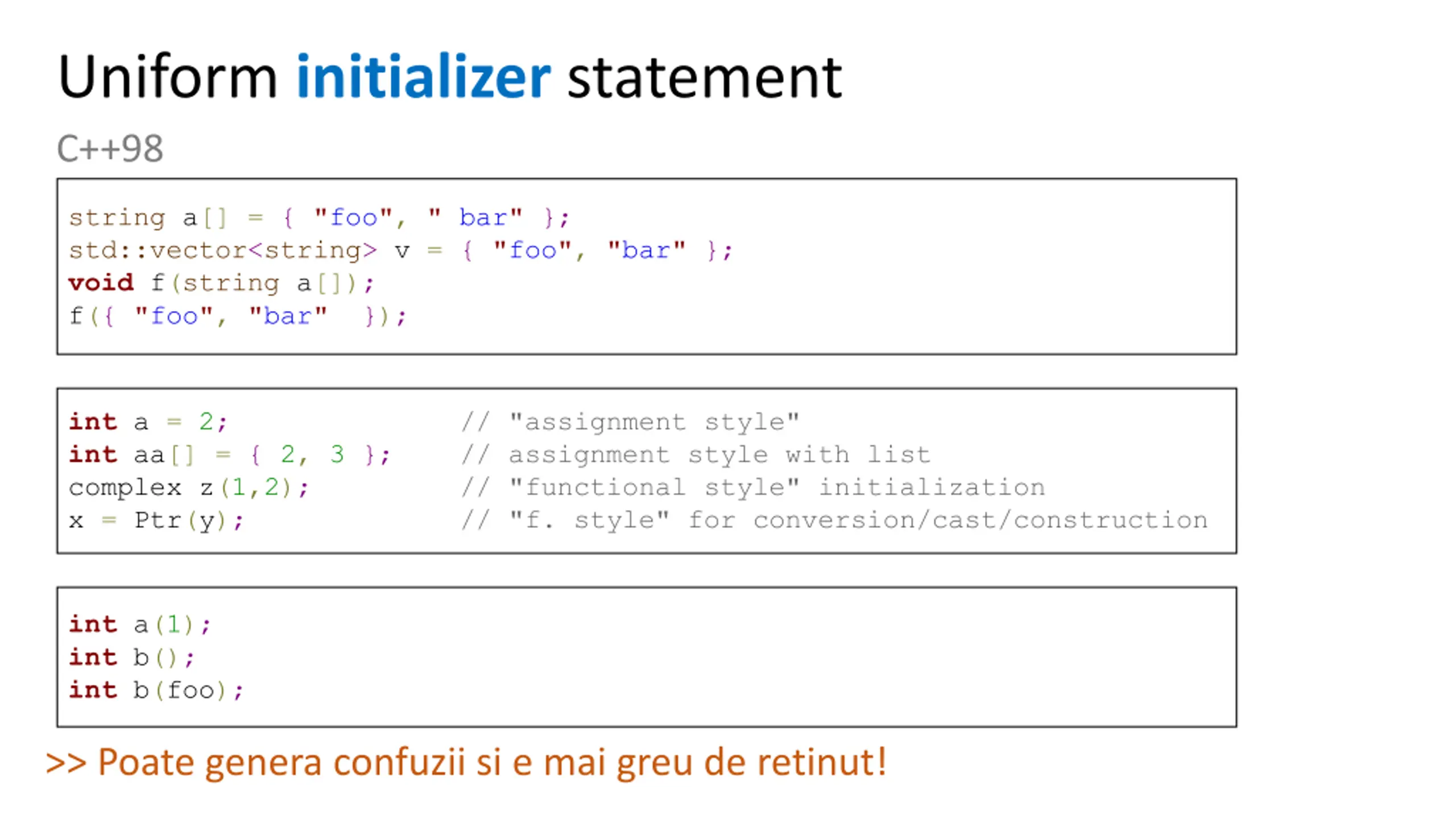 Uniform initializer statement C++98 string a[] = { "foo", " bar" }; std::vector<string> v = { "foo", "bar" }; void f(string a[]); f({ "foo", "bar" }}); int a = 2; // "assignment style" int aa[] = { 2, 3 }; // assignment style with list complex z(1,2); // "functional style" initialization x = Ptr(y); // "f. style" for conversion/cast/construction int a(1); int b(); int b(foo); >> Poate genera confuzii si e mai greu de retinut!
