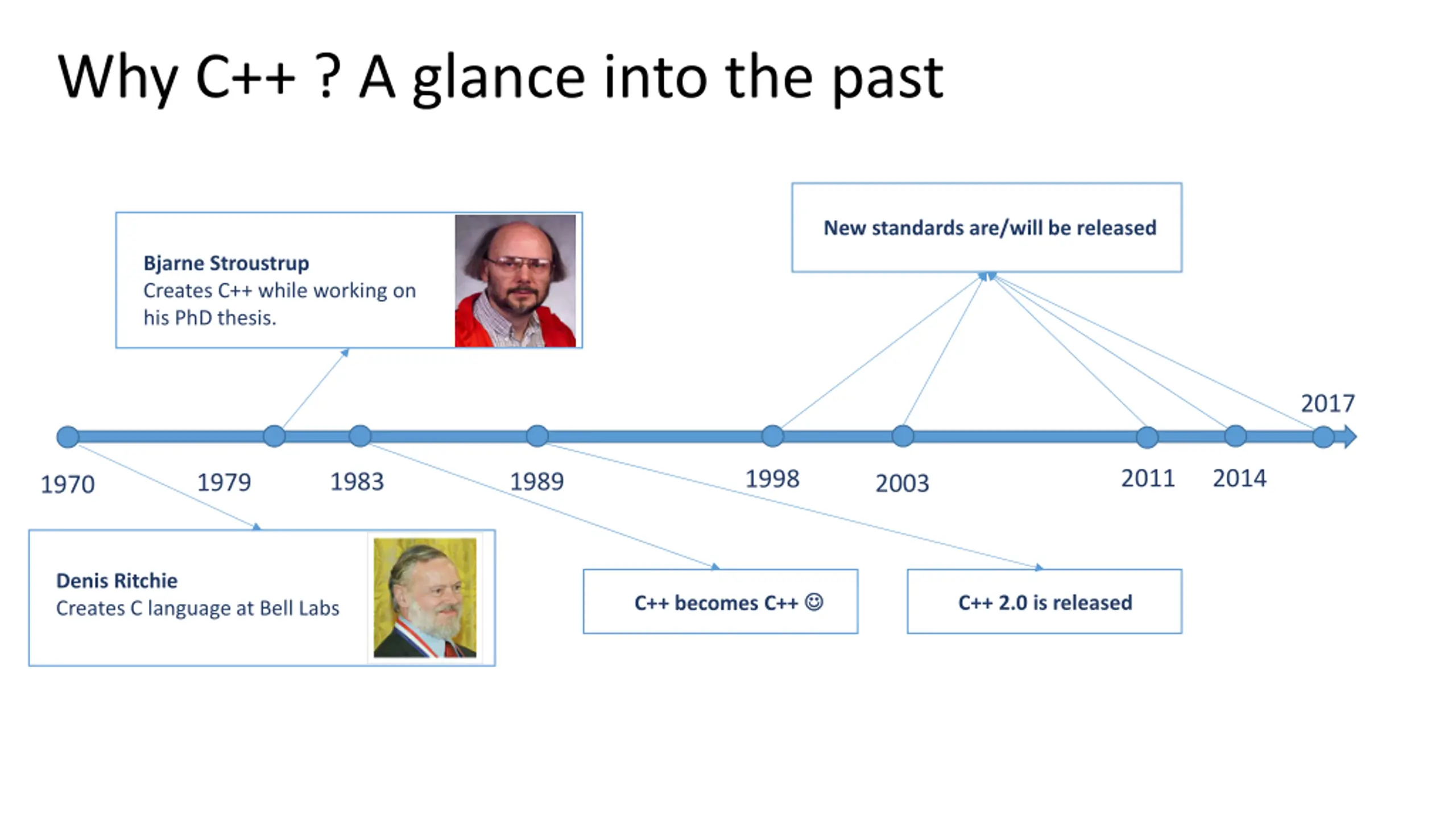 Why C++ ? A glance into the past New standards are/will be released Bjarne Stroustrup Creates C++ while working on his PhD thesis. 2017 2011 2014 1998 1983 1989 1979 2003 1970 Denis Ritchie Creates C language at Bell Labs C++ becomes C++ C++ 2.0 is released