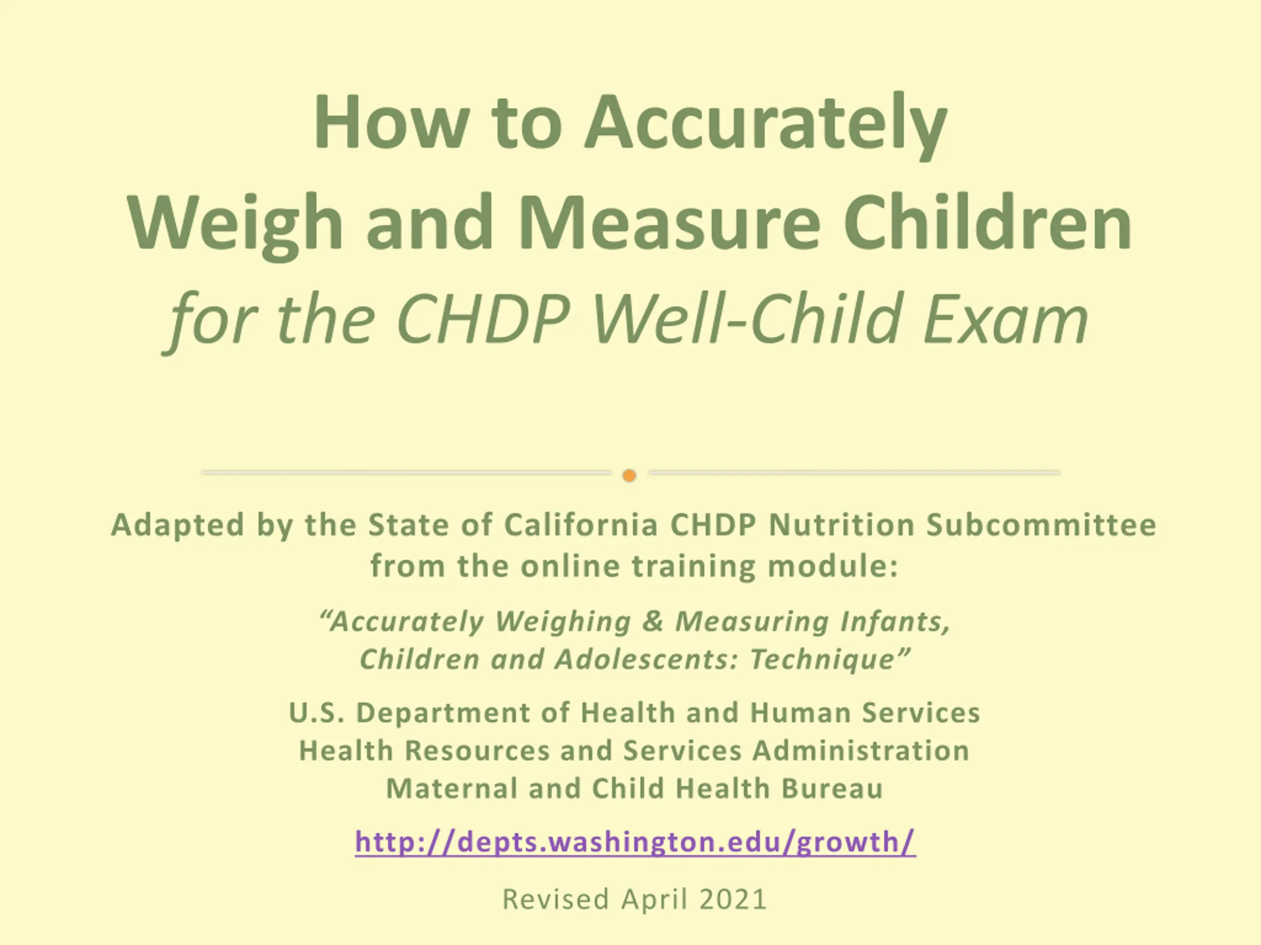 How to Accurately Weigh and Measure Children for the CHDP Well-Child Exam Adapted by the State of California CHDP Nutrition Subcommittee from the online training module: Accurately Weighing & Measuring Infants, Children and Adolescents: Technique U.S. Department of Health and Human Services Health Resources and Services Administration Maternal and Child Health Bureau http://depts.washington.edu/growth/ Revised April 2021