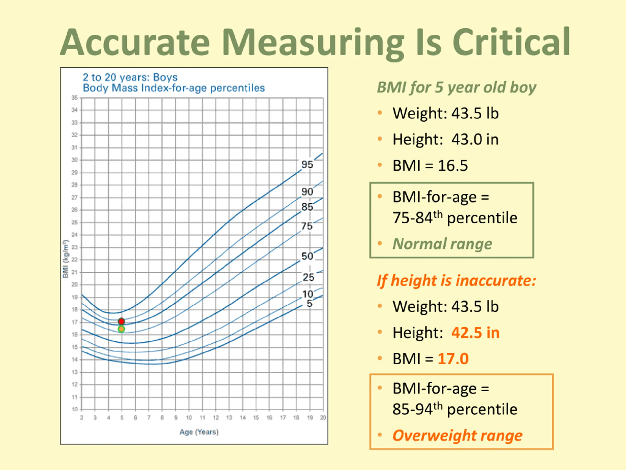 Accurate Measuring Is Critical BMI for 5 year old boy Weight: 43.5 lb Height: 43.0 in BMI = 16.5 BMI-for-age = 75-84th percentile Normal range If height is inaccurate: Weight: 43.5 lb Height: 42.5 in BMI = 17.0 BMI-for-age = 85-94th percentile Overweight range