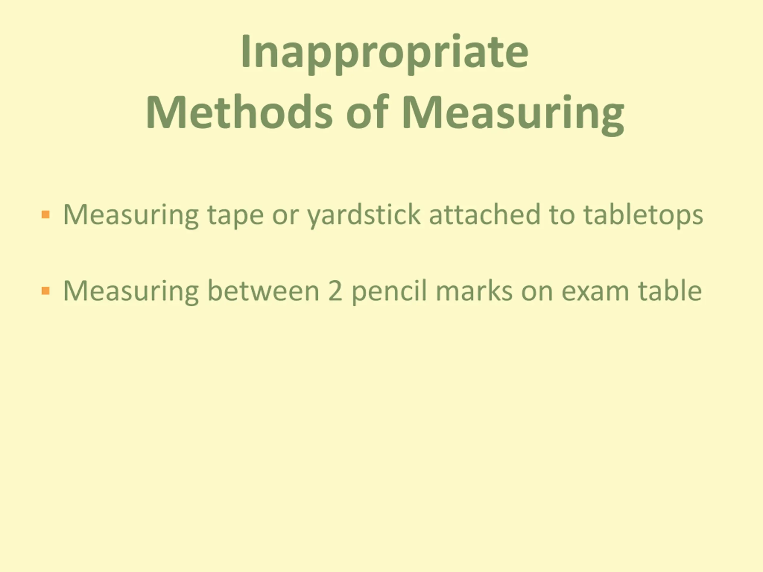 Inappropriate Methods of Measuring Measuring tape or yardstick attached to tabletops Measuring between 2 pencil marks on exam table