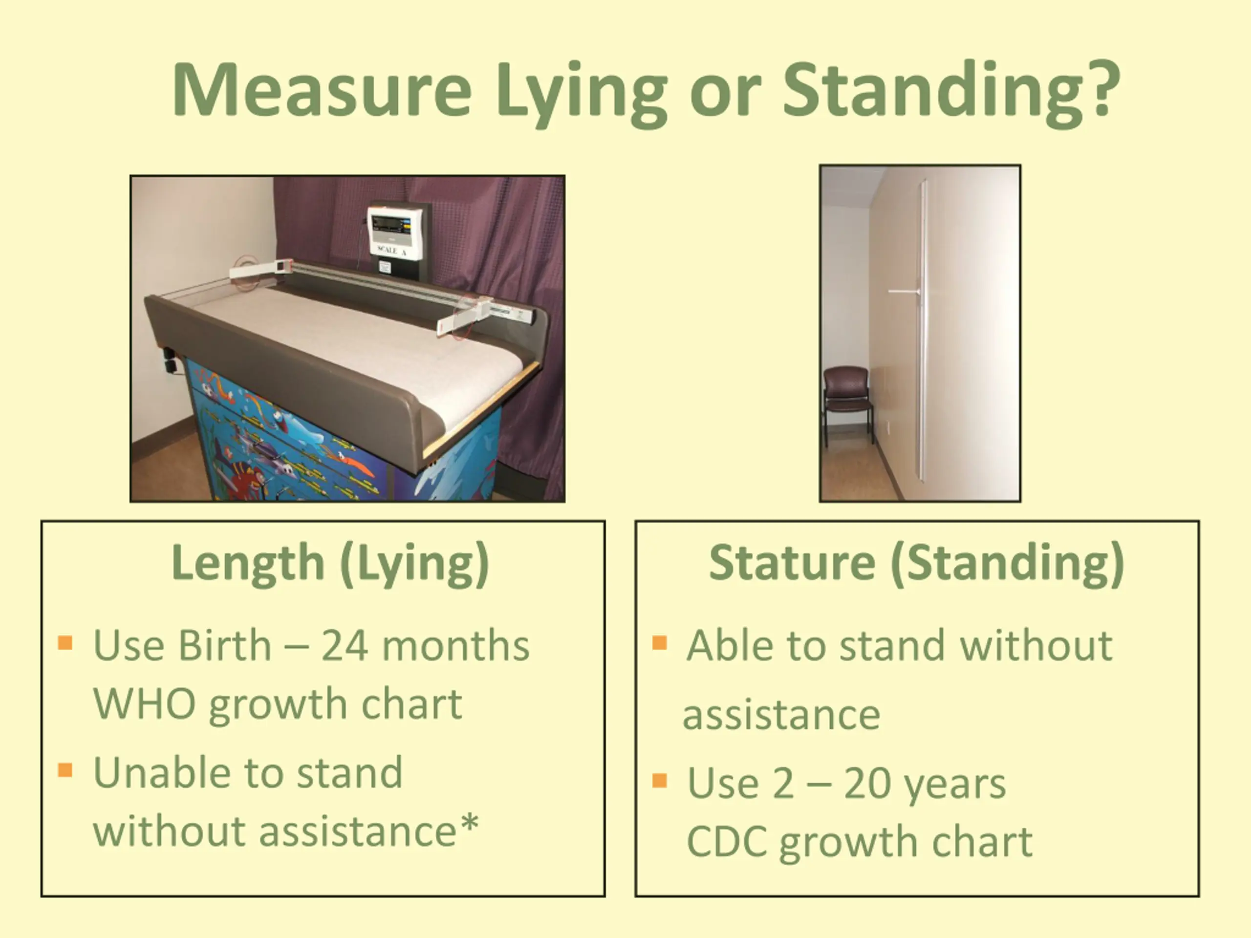 Measure Lying or Standing? Length (Lying) Use Birth 24 months WHO growth chart Unable to stand without assistance* Stature (Standing) Able to stand without assistance Use 2 20 years CDC growth chart