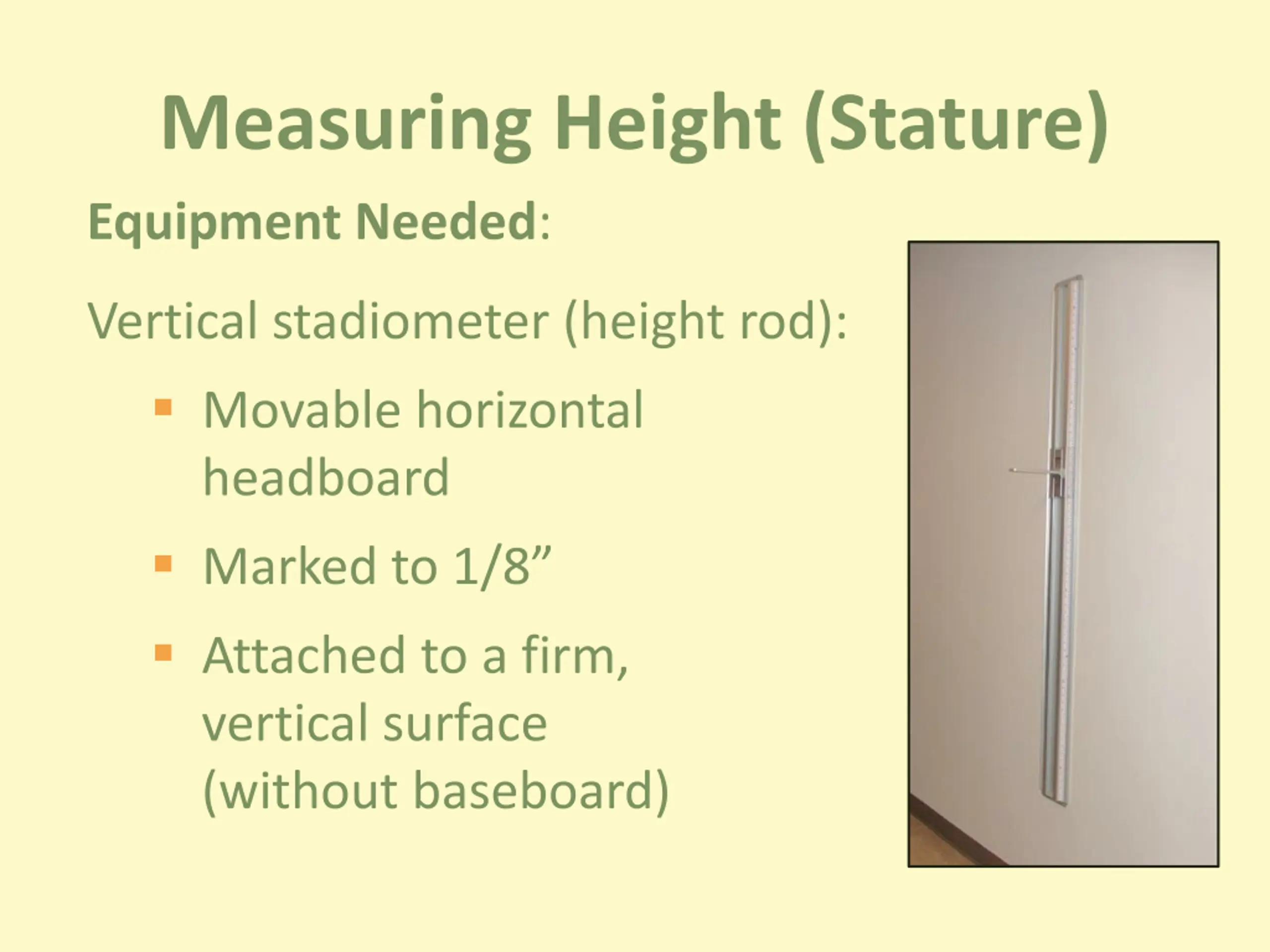 Measuring Height (Stature) Equipment Needed: Vertical stadiometer (height rod): Movable horizontal headboard Marked to 1/8 Attached to a firm, vertical surface (without baseboard)