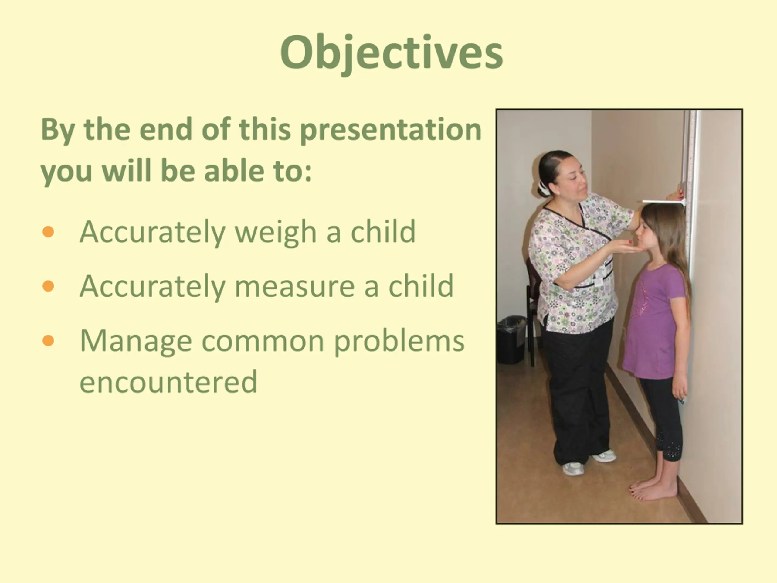 Objectives By the end of this presentation you will be able to: Accurately weigh a child Accurately measure a child Manage common problems encountered