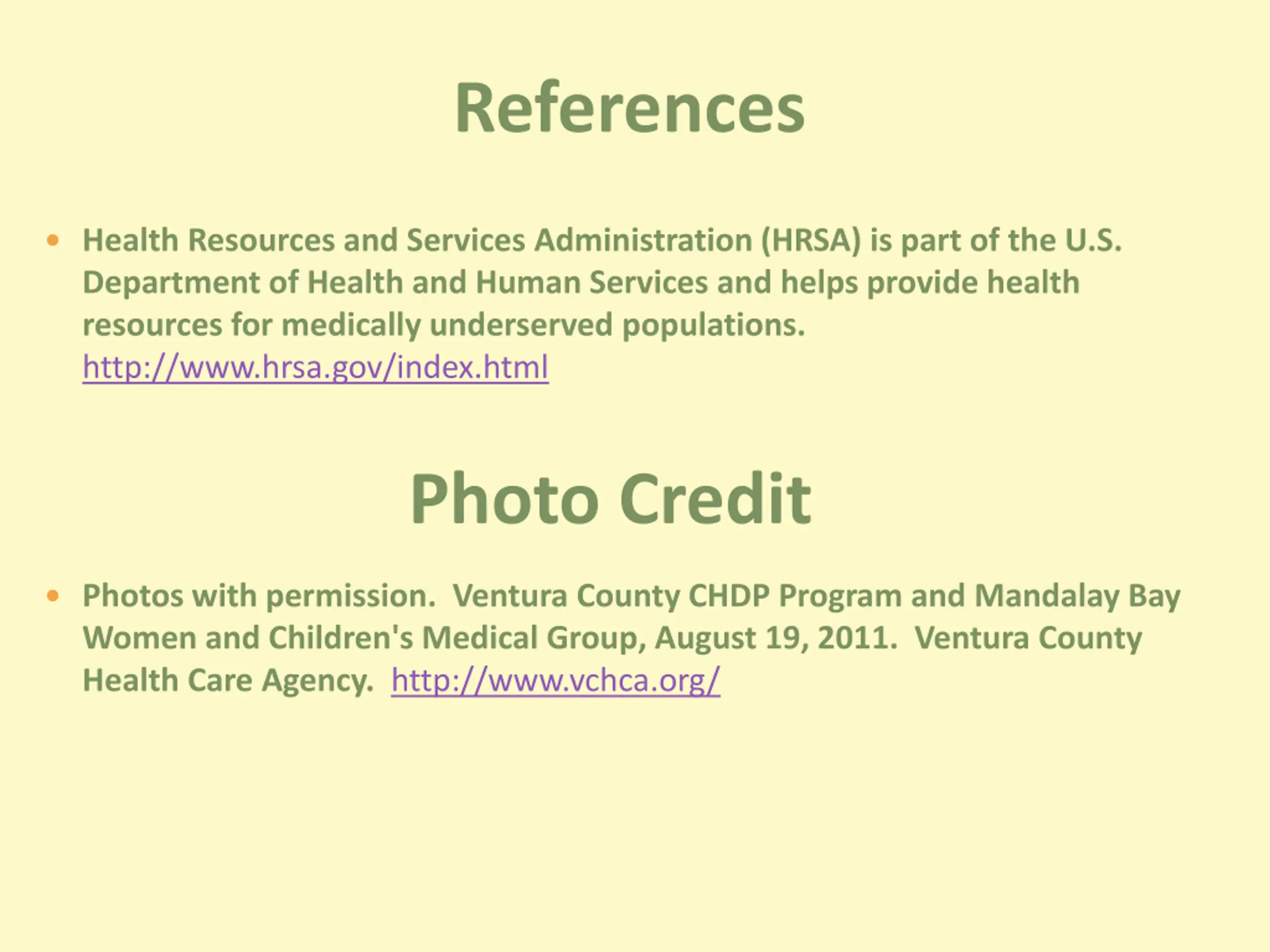 References Health Resources and Services Administration (HRSA) is part of the U.S. Department of Health and Human Services and helps provide health resources for medically underserved populations. http://www.hrsa.gov/index.html Photo Credit Photos with permission. Ventura County CHDP Program and Mandalay Bay Women and Children's Medical Group, August 19, 2011. Ventura County Health Care Agency. http://www.vchca.org/