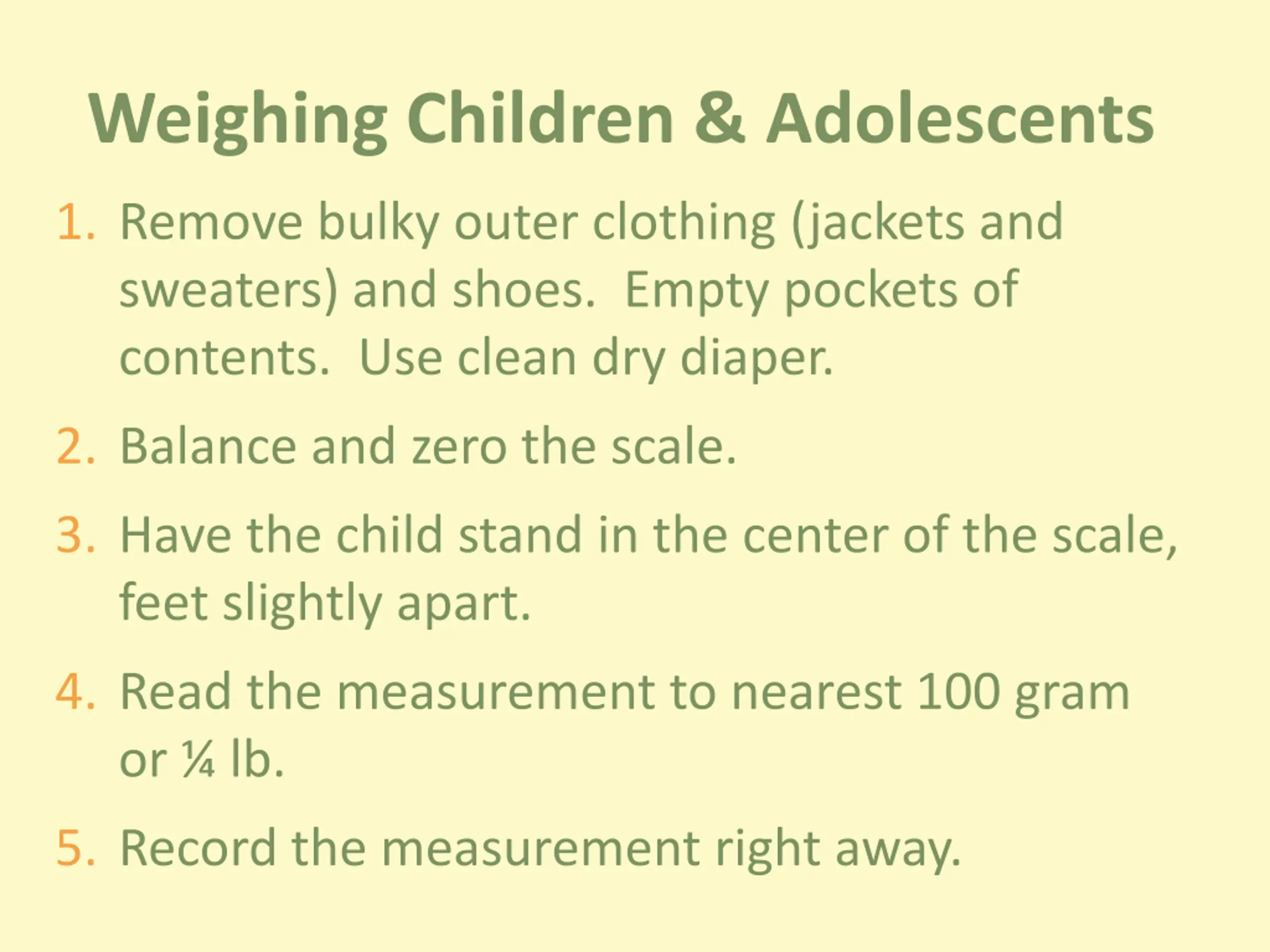 Weighing Children & Adolescents 1. Remove bulky outer clothing (jackets and sweaters) and shoes. Empty pockets of contents. Use clean dry diaper. 2. Balance and zero the scale. 3. Have the child stand in the center of the scale, feet slightly apart. 4. Read the measurement to nearest 100 gram or lb. 5. Record the measurement right away.