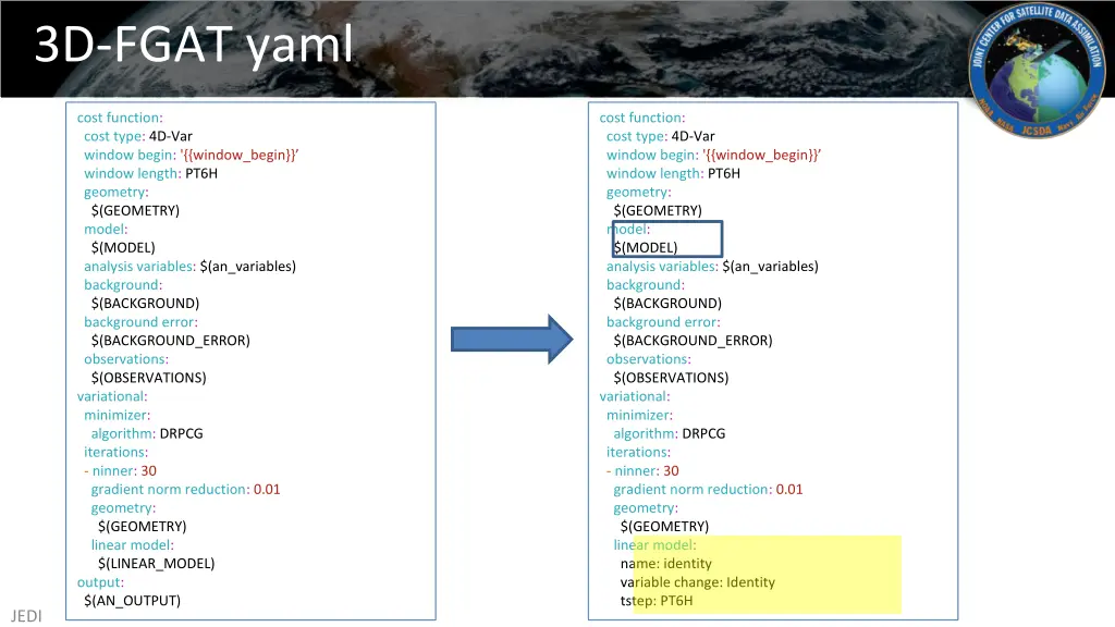 4D-Var yaml cost function: cost type: 4D-Var window begin: '{{window_begin}} window length: PT6H geometry: $(GEOMETRY) model: $(MODEL) analysis variables: $(an_variables) background: $(BACKGROUND) background error: $(BACKGROUND_ERROR) observations: $(OBSERVATIONS) variational: minimizer: algorithm: DRPCG iterations: - ninner: 30 gradient norm reduction: 0.01 geometry: $(GEOMETRY) linear model: $(LINEAR_MODEL) output: $(AN_OUTPUT) cost function: cost type: 3D-Var window begin: '{{window_begin}} window length: PT6H geometry: $(GEOMETRY) analysis variables: $(an_variables) background: $(BACKGROUND) background error: $(BACKGROUND_ERROR) observations: $(OBSERVATIONS) variational: minimizer: algorithm: DRPCG iterations: - ninner: 30 gradient norm reduction: 0.01 geometry: $(GEOMETRY) output: $(AN_OUTPUT) 3D-Var JEDI