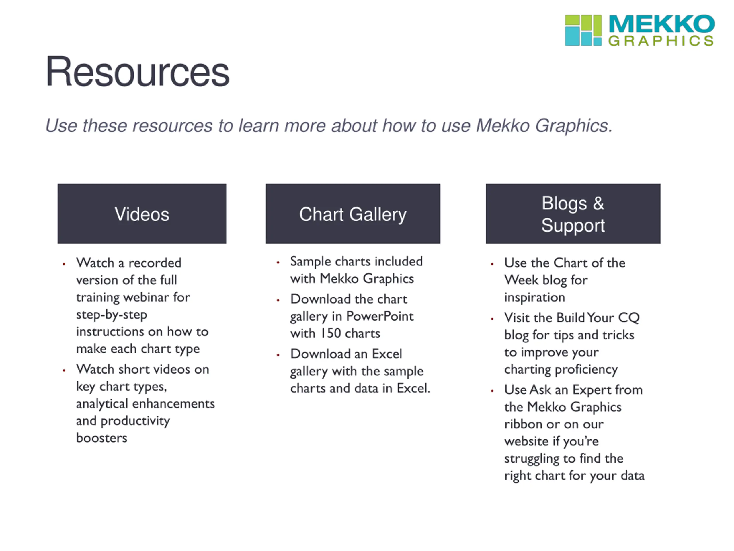 Resources Use these resources to learn more about how to use Mekko Graphics. Blogs & Support Videos Chart Gallery Sample charts included with Mekko Graphics Download the chart gallery in PowerPoint with 150 charts Download an Excel gallery with the sample charts and data in Excel. Watch a recorded version of the full training webinar for step-by-step instructions on how to make each chart type Watch short videos on key chart types, analytical enhancements and productivity boosters Use the Chart of the Week blog for inspiration Visit the Build Your CQ blog for tips and tricks to improve your charting proficiency Use Ask an Expert from the Mekko Graphics ribbon or on our website if you re struggling to find the right chart for your data