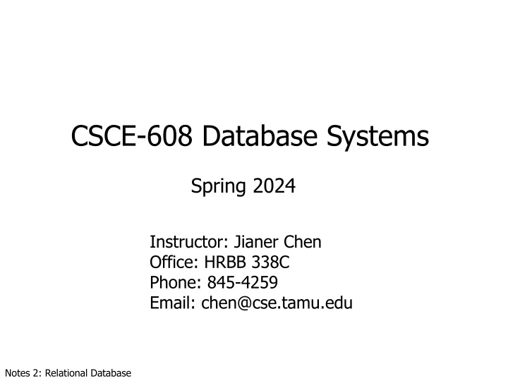CSCE-608 Database Systems Spring 2024 Instructor: Jianer Chen Office: HRBB 338C Phone: 845-4259 Email: chen@cse.tamu.edu Notes 2: Relational Database