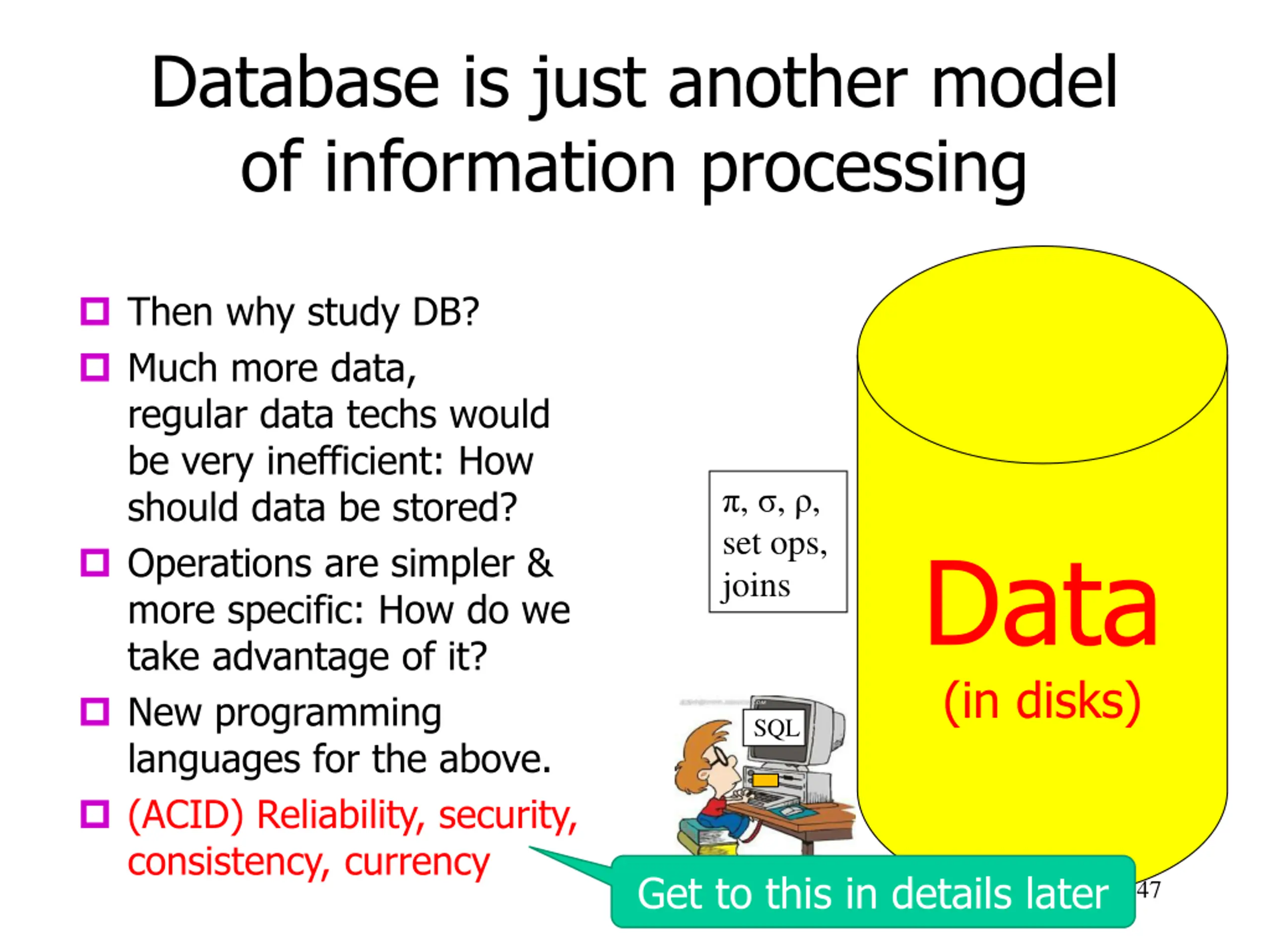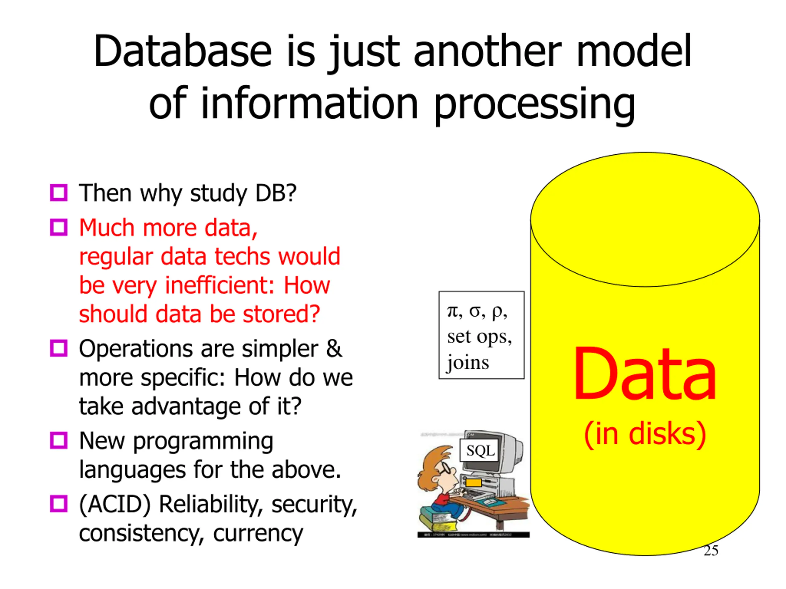 Database is just another model of information processing Then why study DB? Much more data, regular data techs would be very inefficient: How should data be stored? Operations are simpler & more specific: How do we take advantage of it? New programming languages for the above. (ACID) Reliability, security, consistency, currency , , , set ops, joins Data (in disks) SQL 3