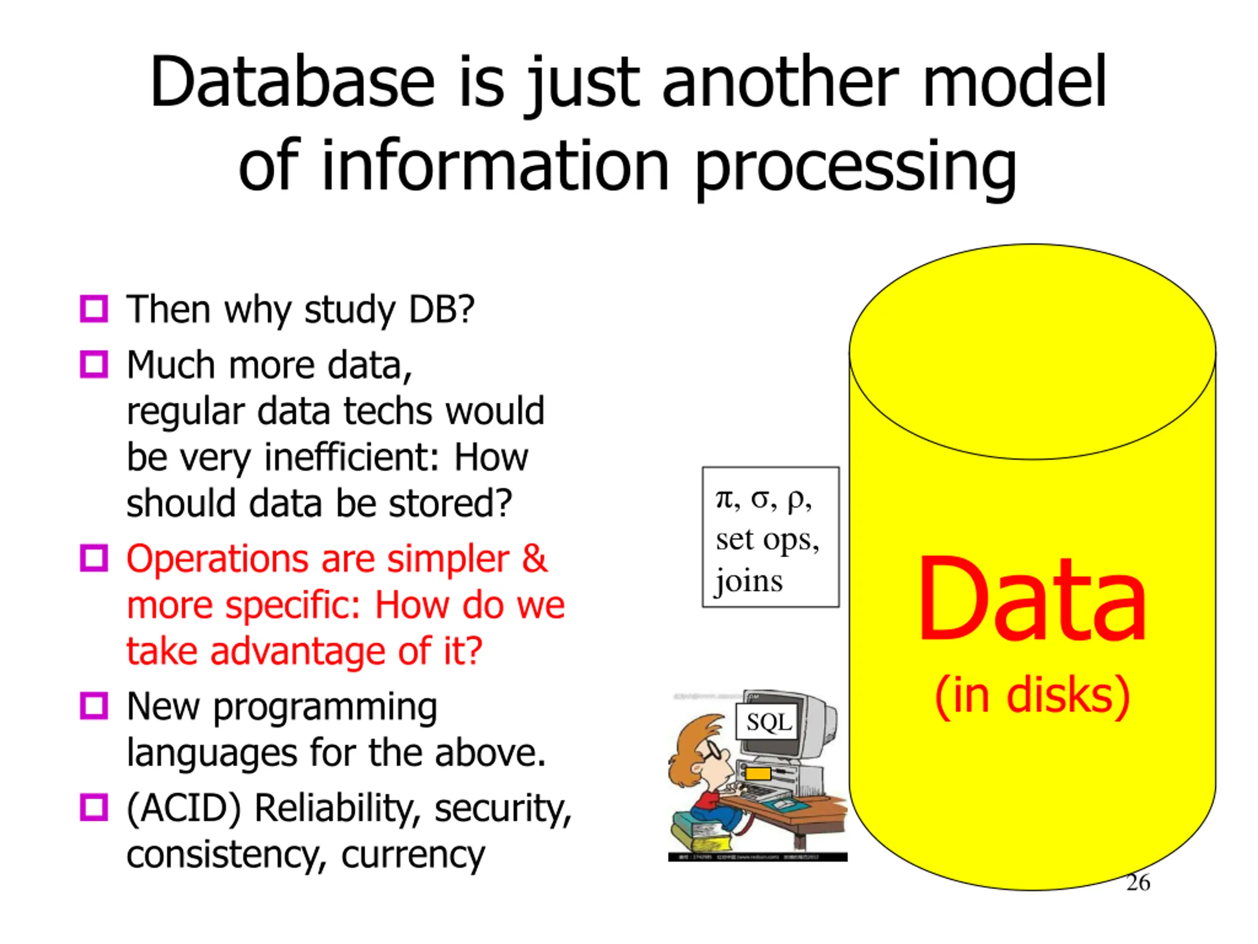 Database is just another model of information processing Then why study DB? Much more data, regular data techs would be very inefficient: How should data be stored? Operations are simpler & more specific: How do we take advantage of it? New programming languages for the above. (ACID) Reliability, security, consistency, currency , , , set ops, joins Data (in disks) SQL 25
