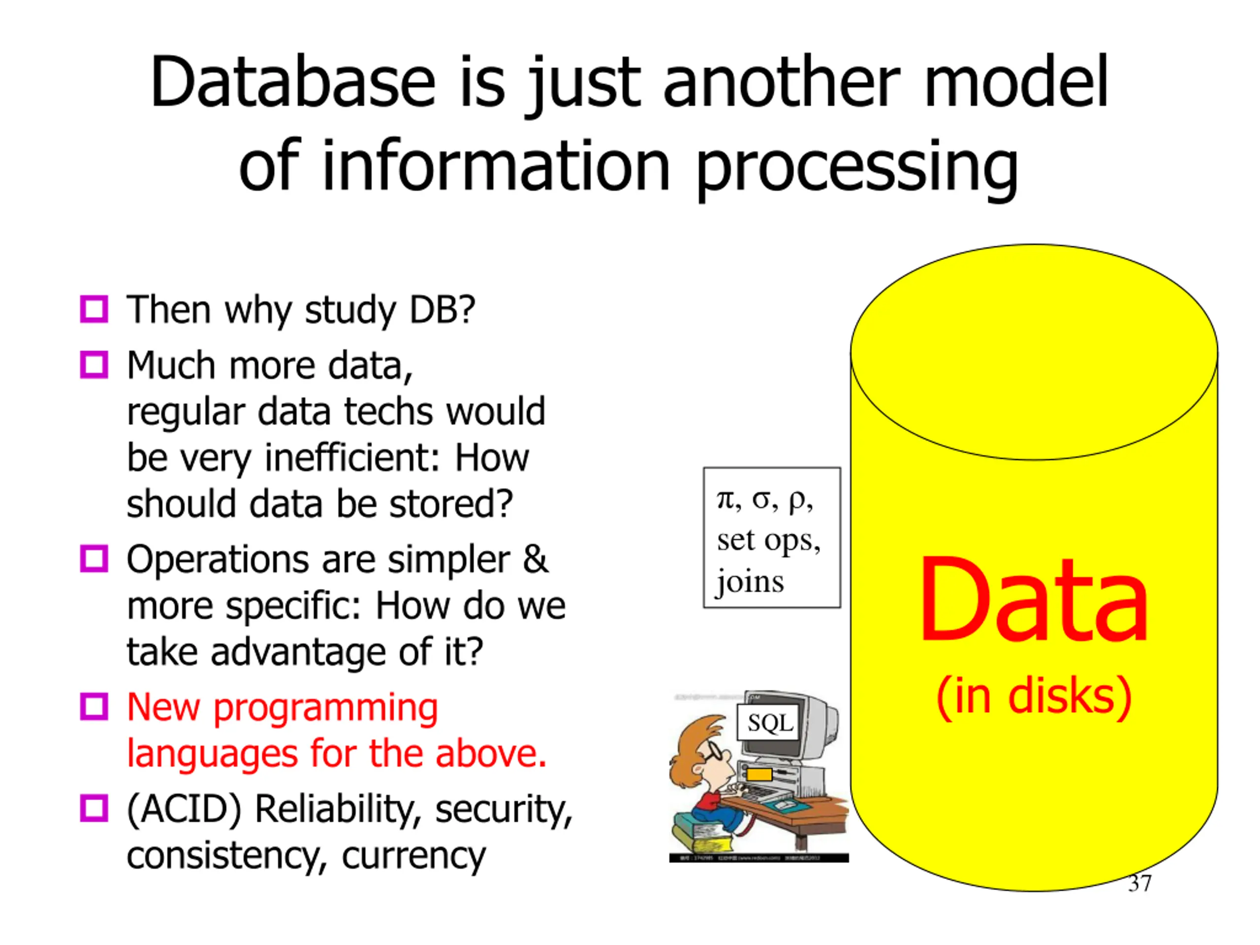 Database is just another model of information processing Then why study DB? Much more data, regular data techs would be very inefficient: How should data be stored? Operations are simpler & more specific: How do we take advantage of it? New programming languages for the above. (ACID) Reliability, security, consistency, currency , , , set ops, joins Data (in disks) SQL 36