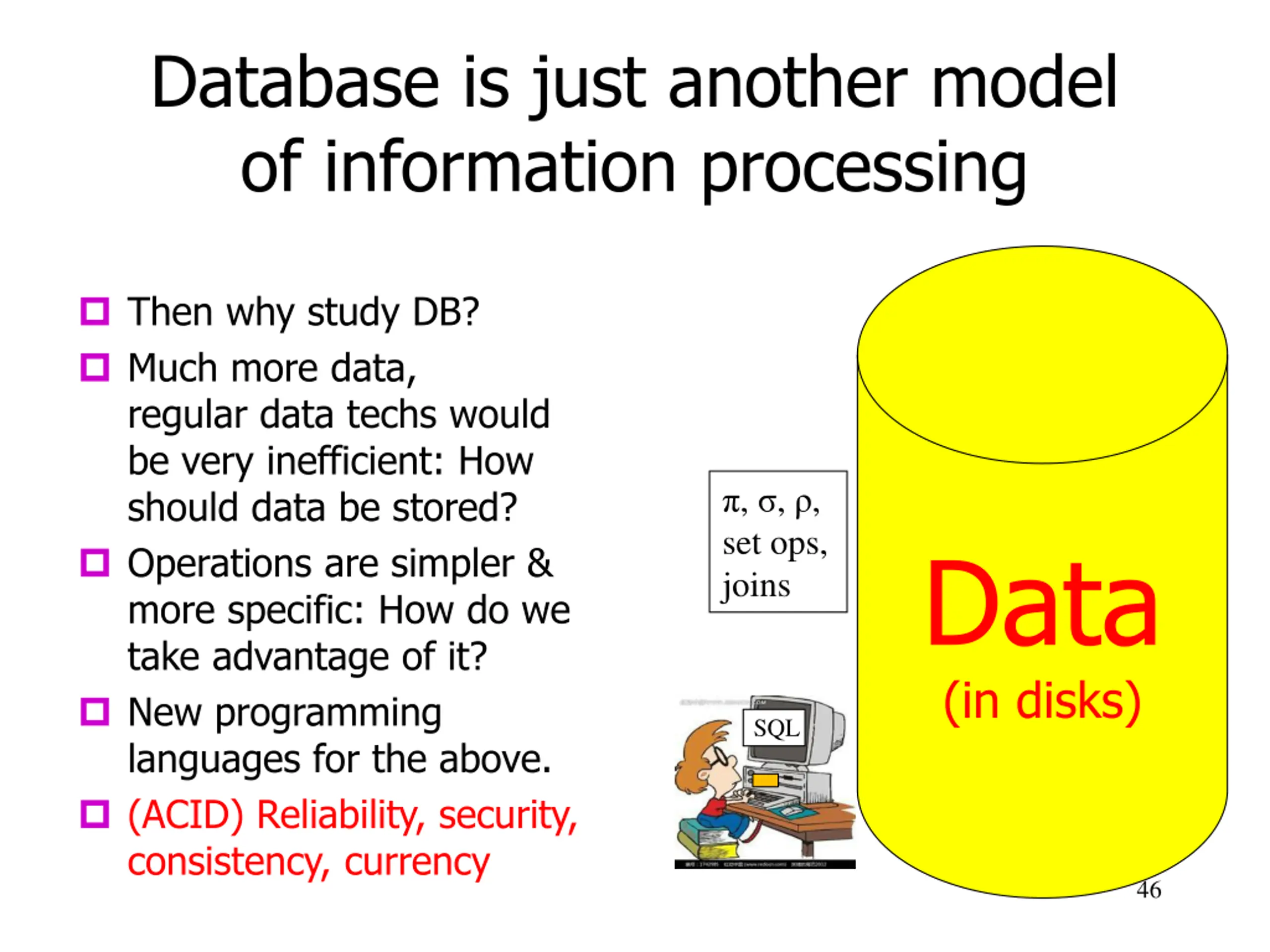 Database is just another model of information processing Then why study DB? Much more data, regular data techs would be very inefficient: How should data be stored? Operations are simpler & more specific: How do we take advantage of it? New programming languages for the above. (ACID) Reliability, security, consistency, currency , , , set ops, joins Data (in disks) SQL 45