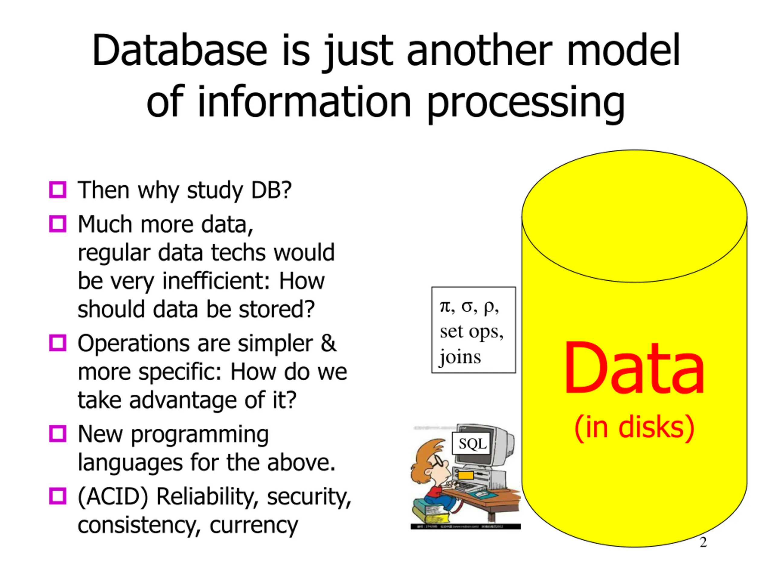 Database is just another model of information processing Then why study DB? Much more data, regular data techs would be very inefficient: How should data be stored? Operations are simpler & more specific: How do we take advantage of it? New programming languages for the above. (ACID) Reliability, security, consistency, currency , , , set ops, joins Data (in disks) SQL 2