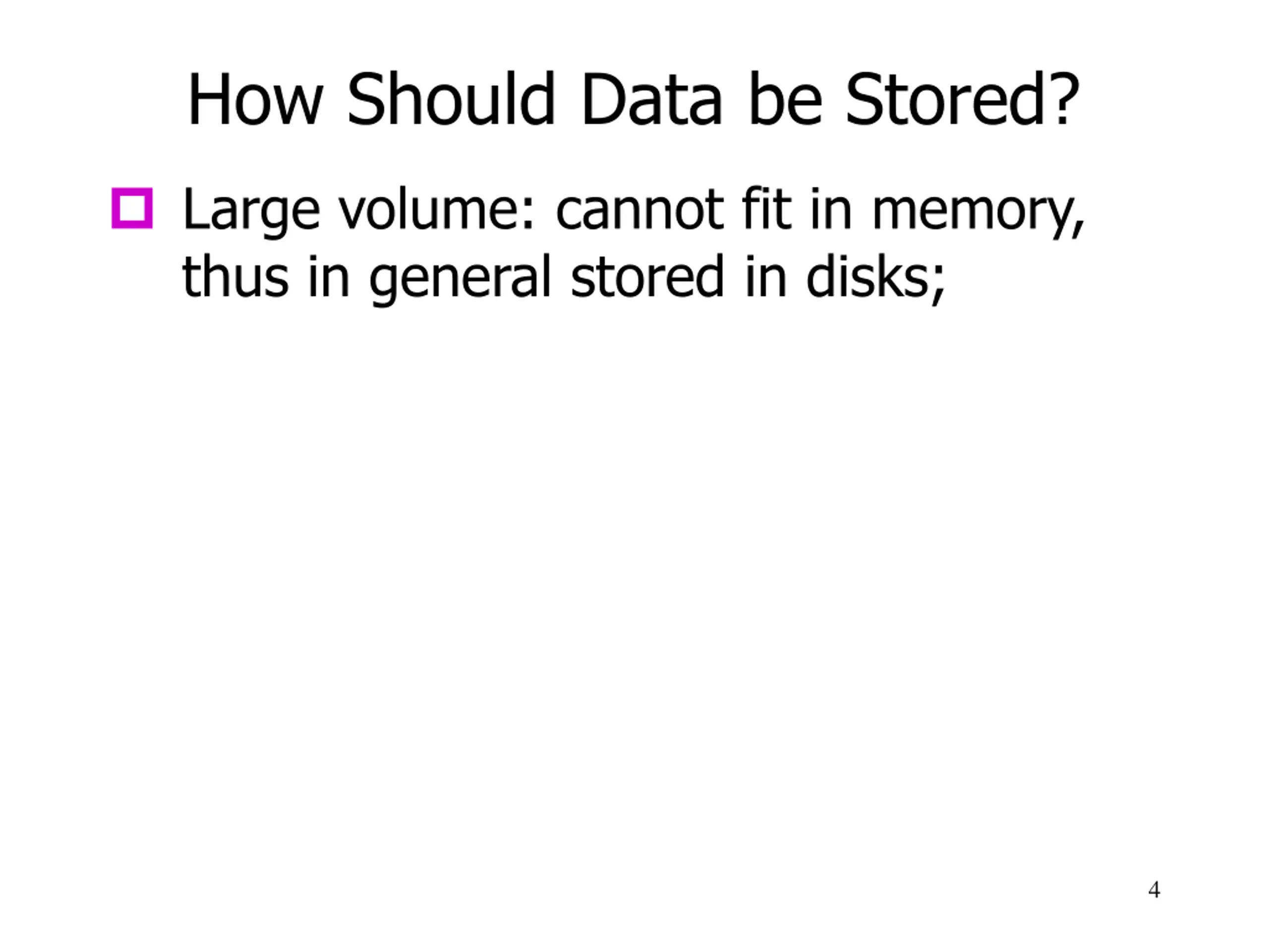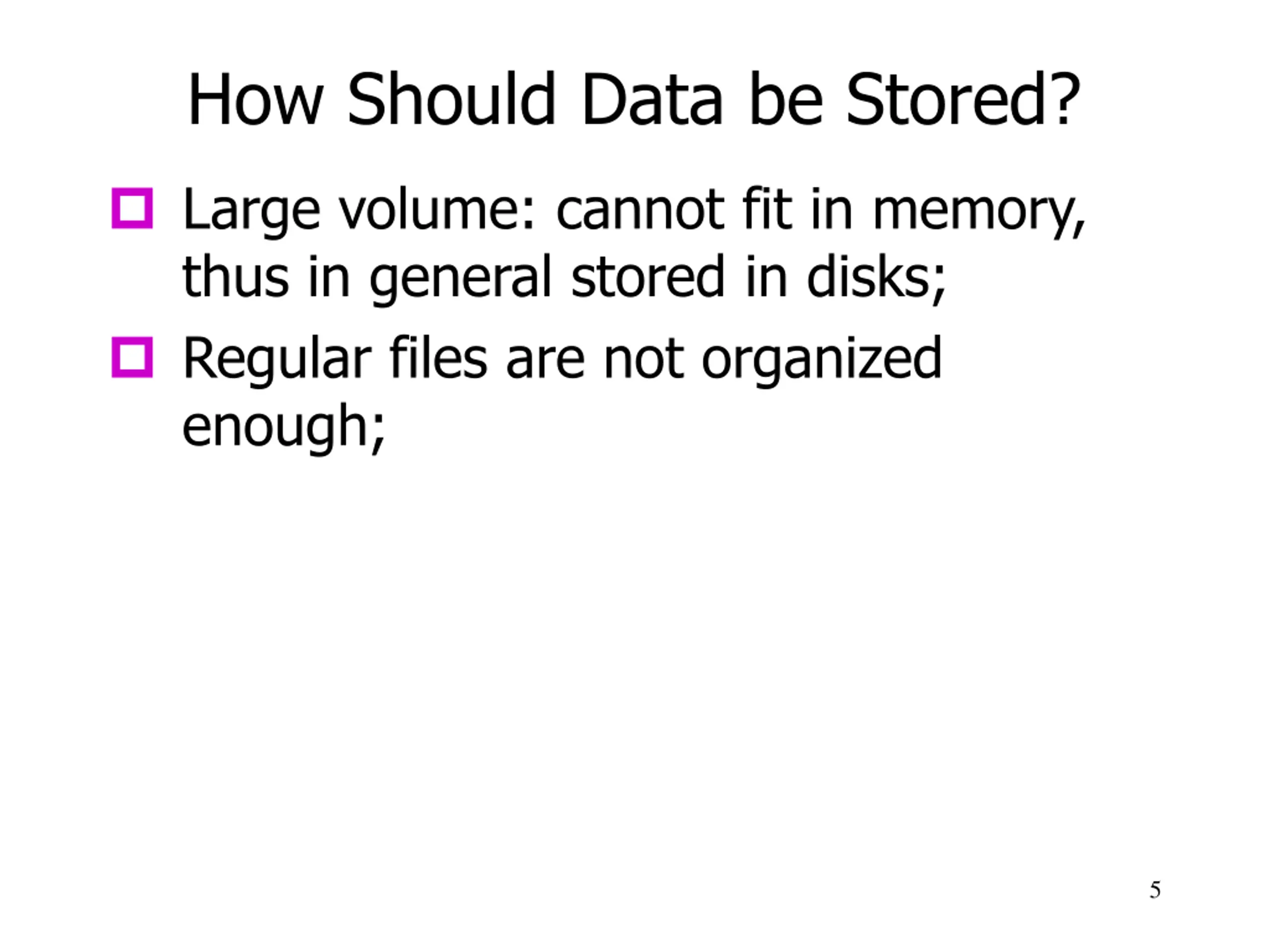 How Should Data be Stored? Large volume: cannot fit in memory, thus in general stored in disks; 4