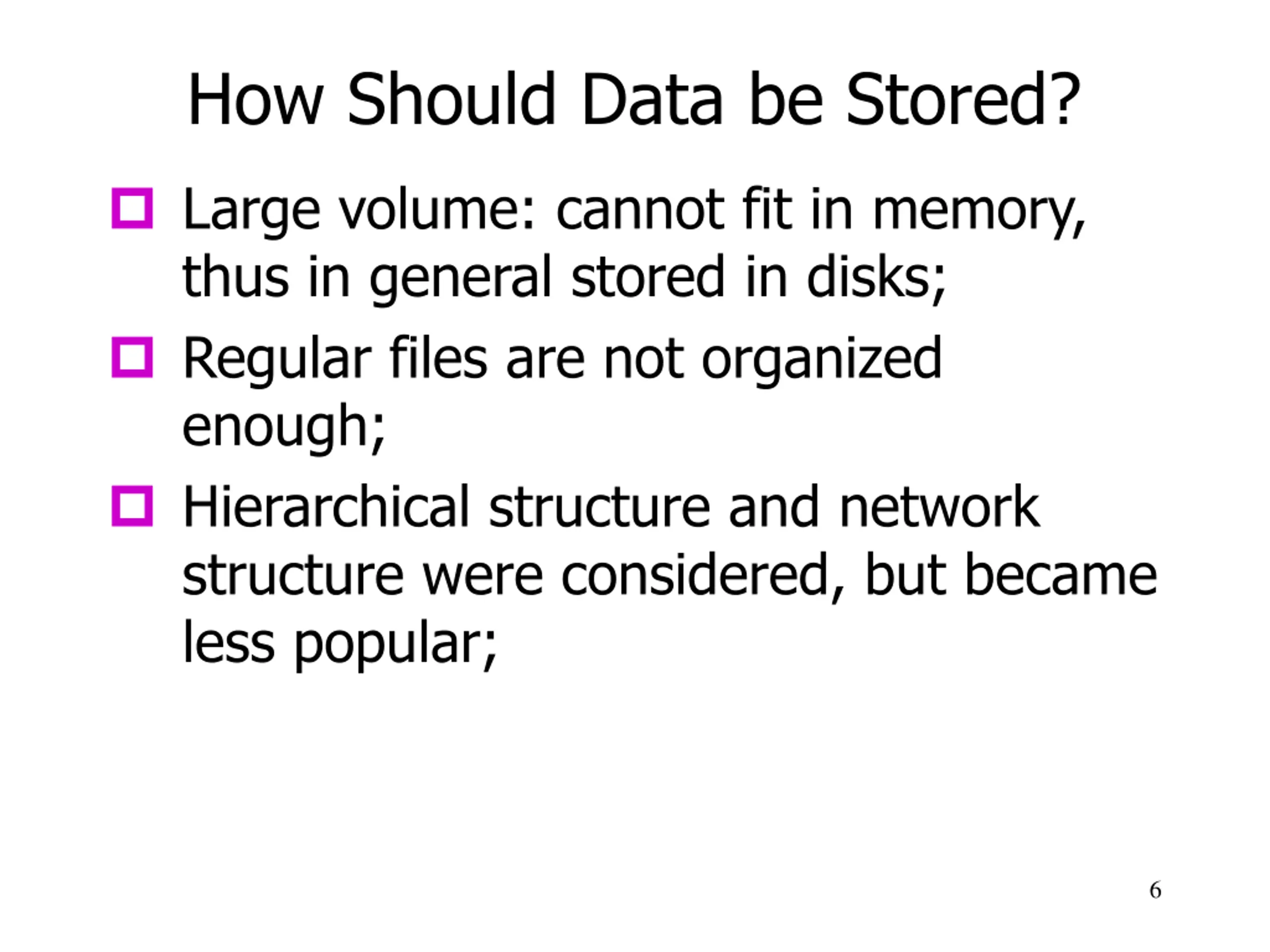 How Should Data be Stored? Large volume: cannot fit in memory, thus in general stored in disks; Regular files are not organized enough; 5