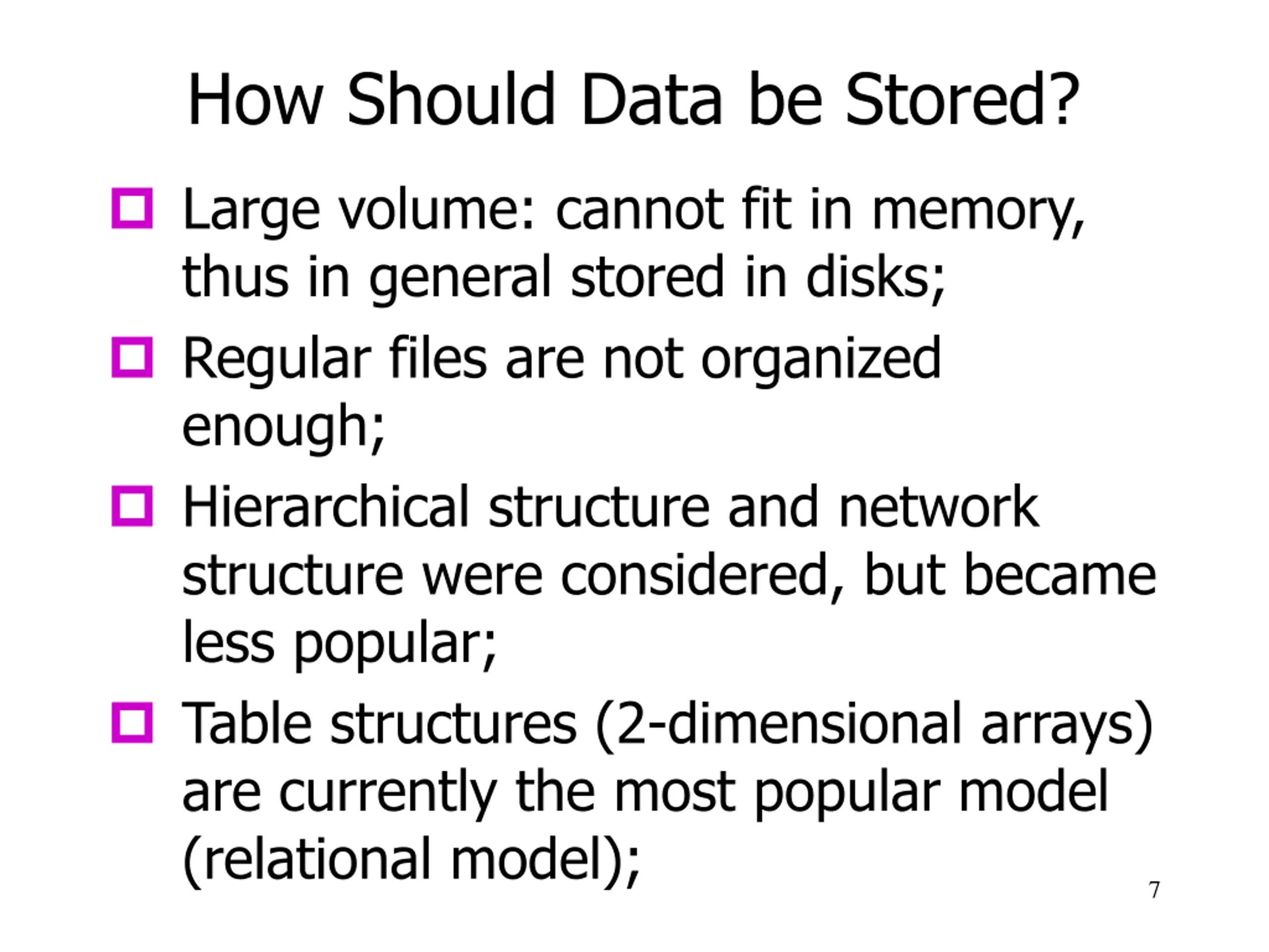 How Should Data be Stored? Large volume: cannot fit in memory, thus in general stored in disks; Regular files are not organized enough; Hierarchical structure and network structure were considered, but became less popular; 6