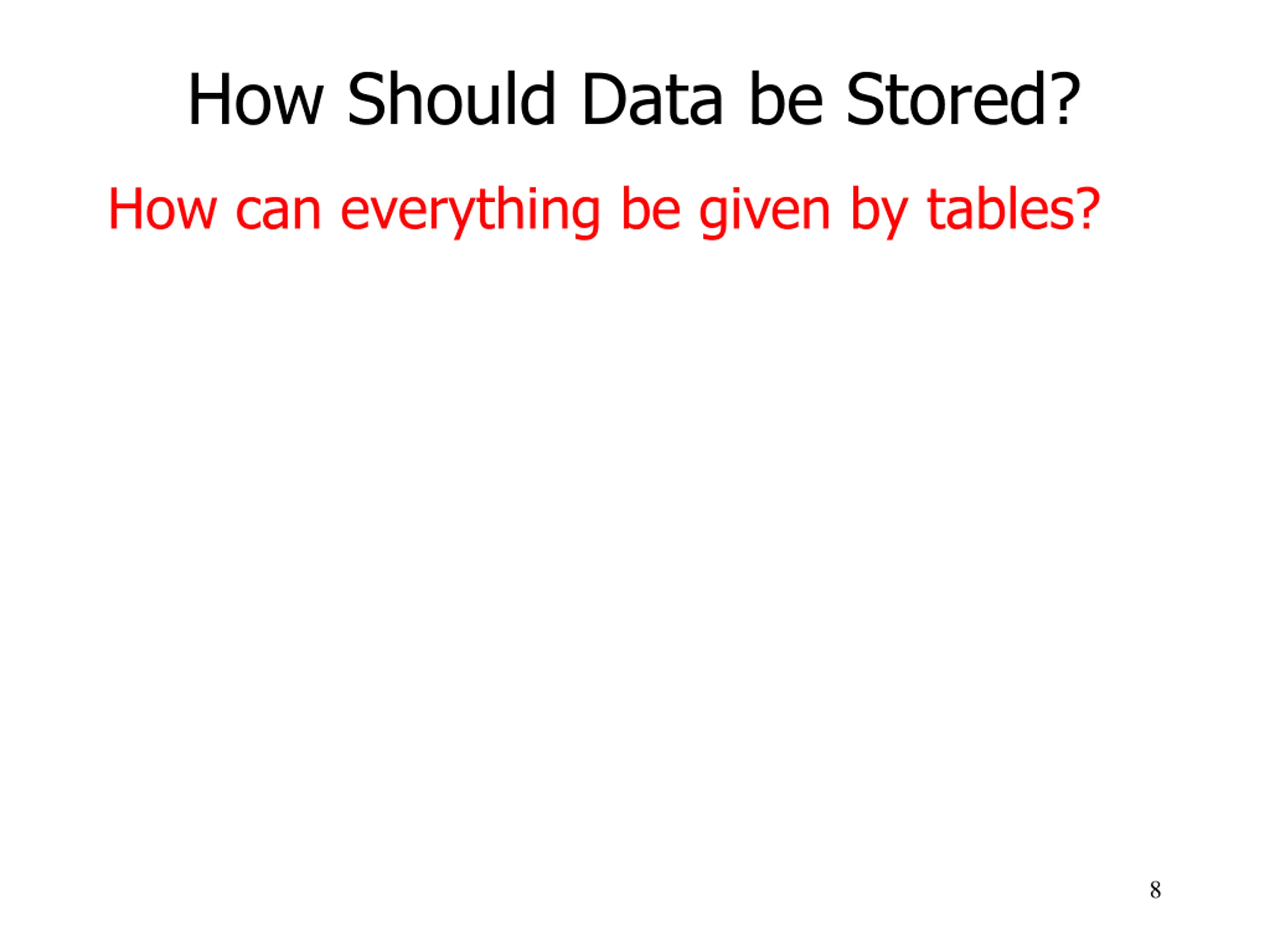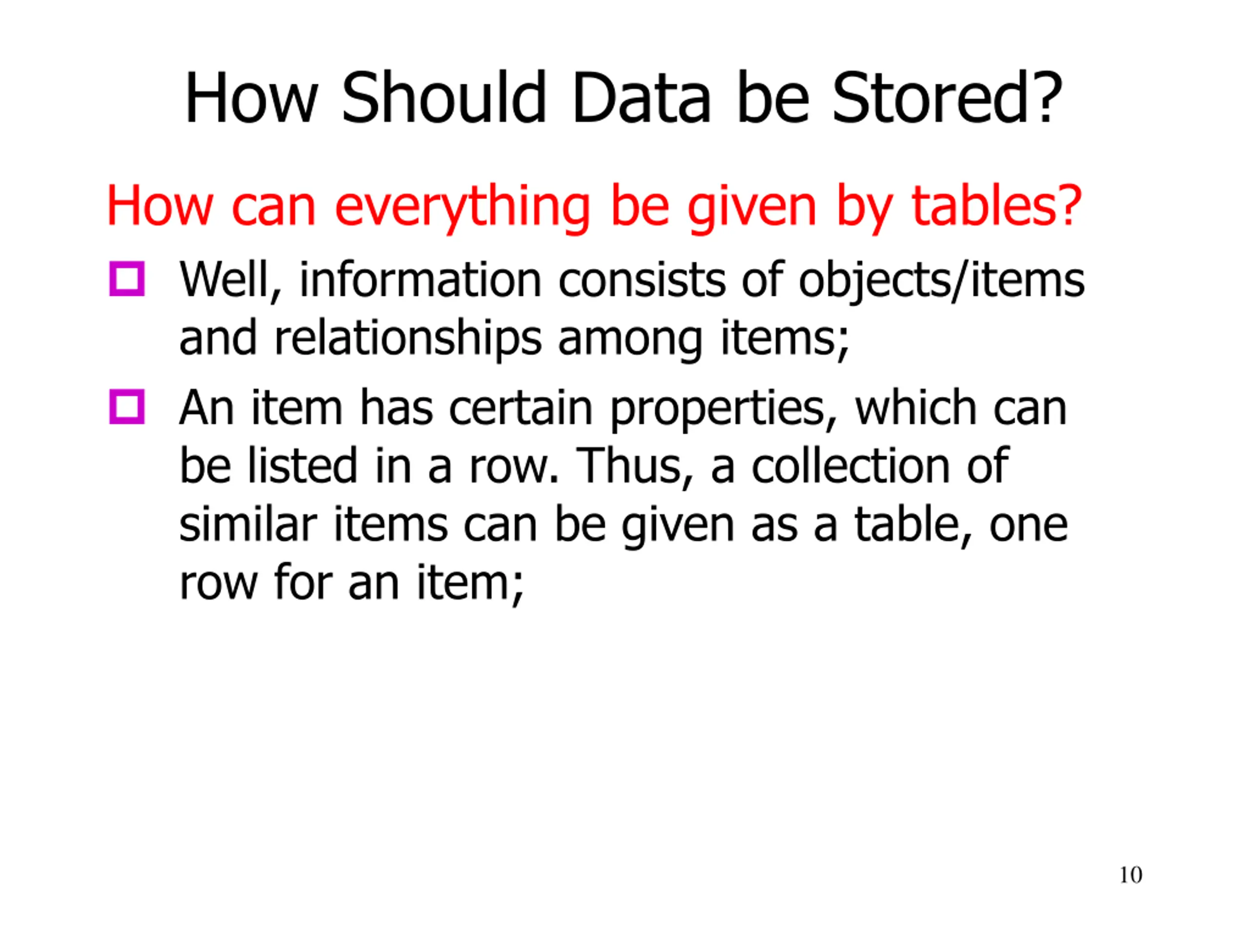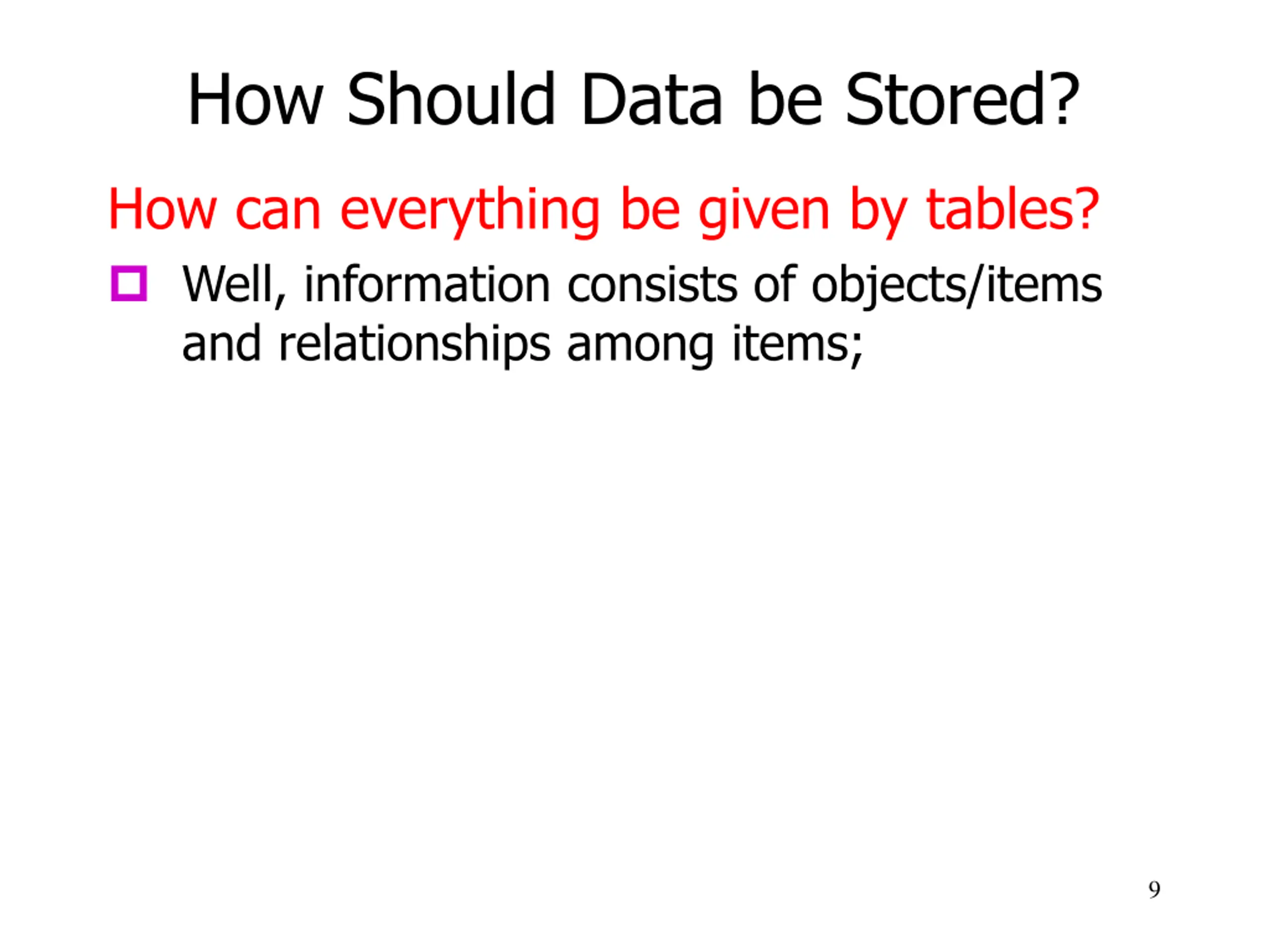 How Should Data be Stored? How can everything be given by tables? Well, information consists of objects/items and relationships among items; 9