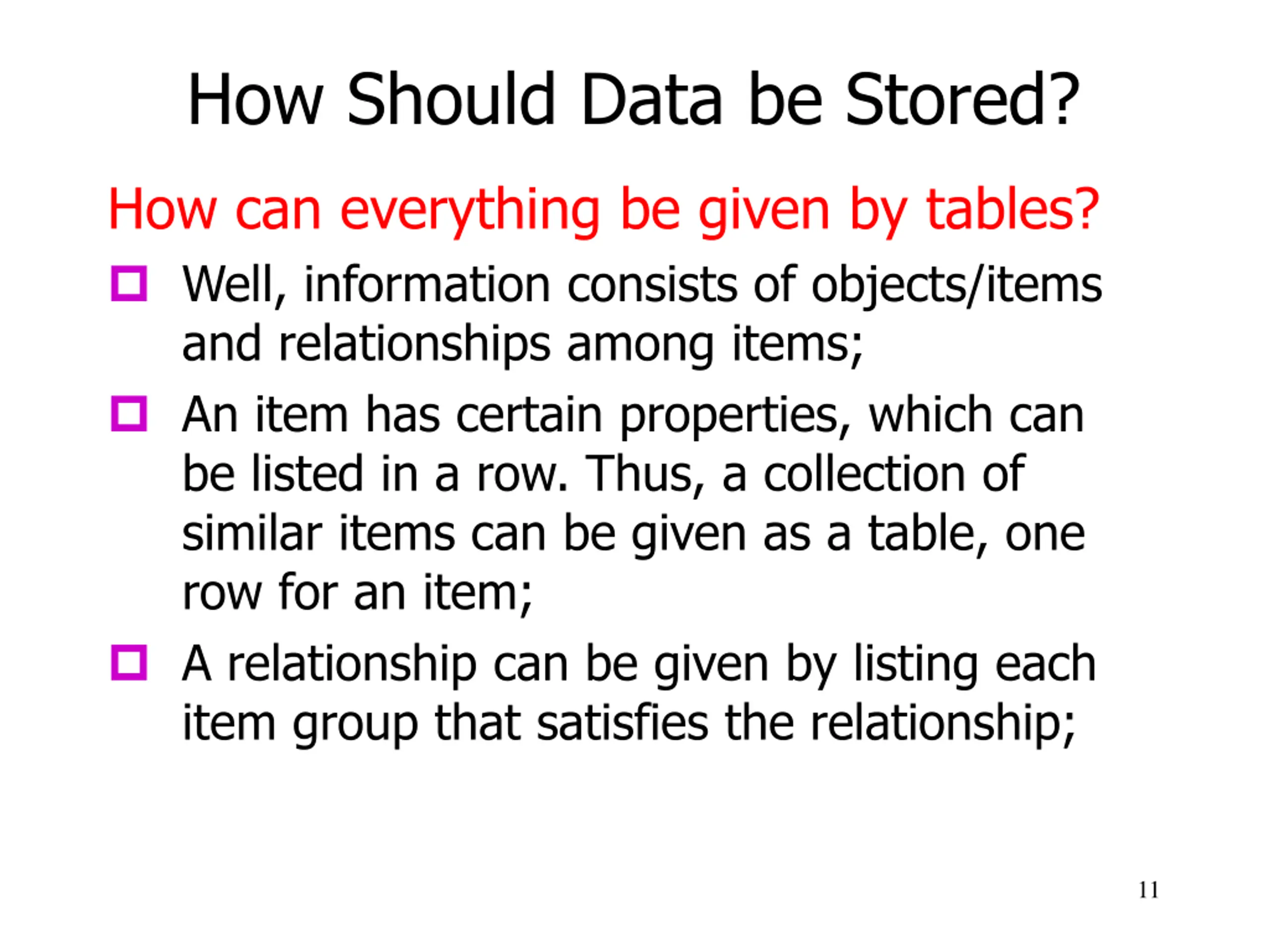 How Should Data be Stored? How can everything be given by tables? Well, information consists of objects/items and relationships among items; An item has certain properties, which can be listed in a row. Thus, a collection of similar items can be given as a table, one row for an item; 10