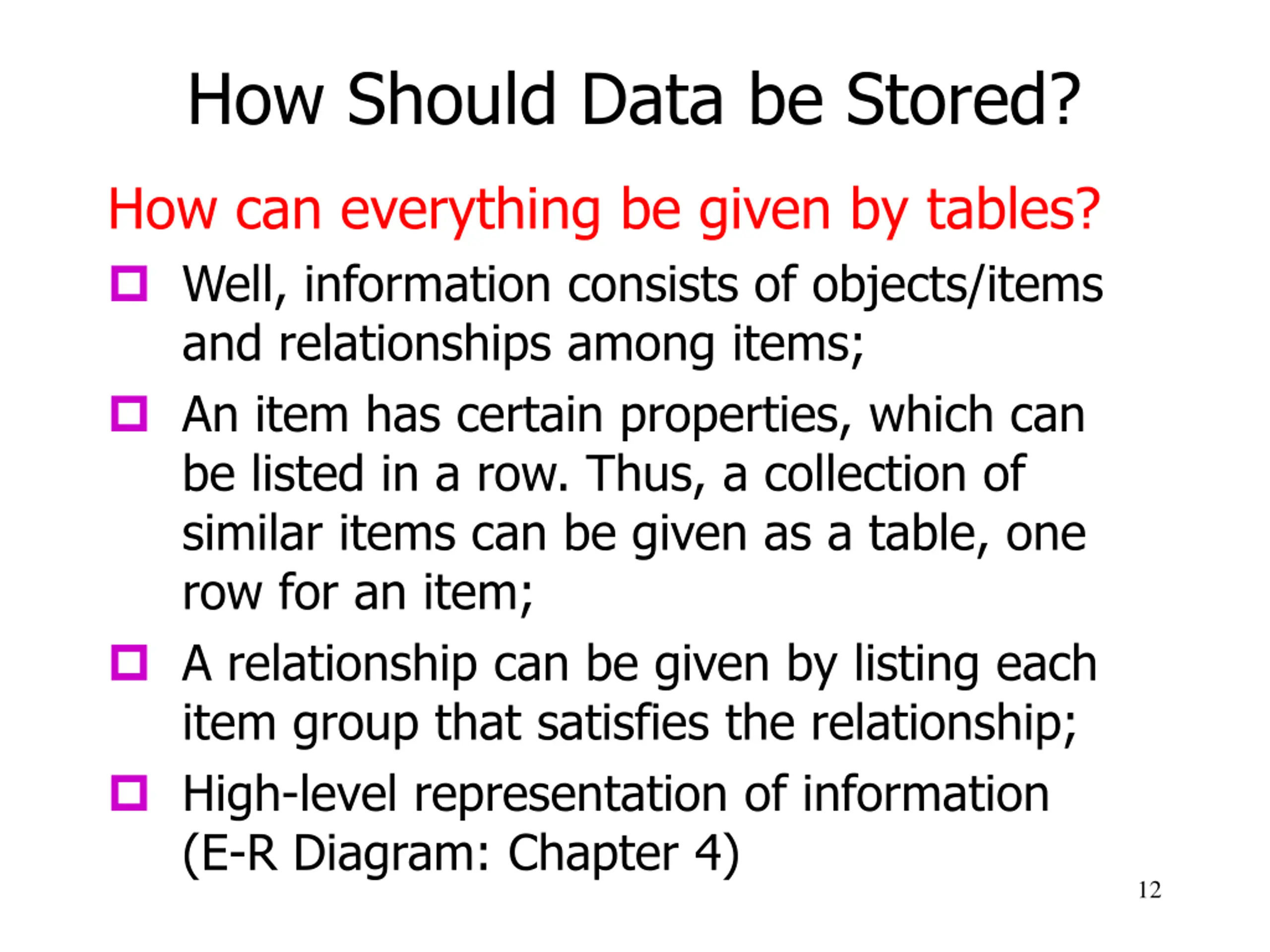 How Should Data be Stored? How can everything be given by tables? Well, information consists of objects/items and relationships among items; An item has certain properties, which can be listed in a row. Thus, a collection of similar items can be given as a table, one row for an item; A relationship can be given by listing each item group that satisfies the relationship; 11