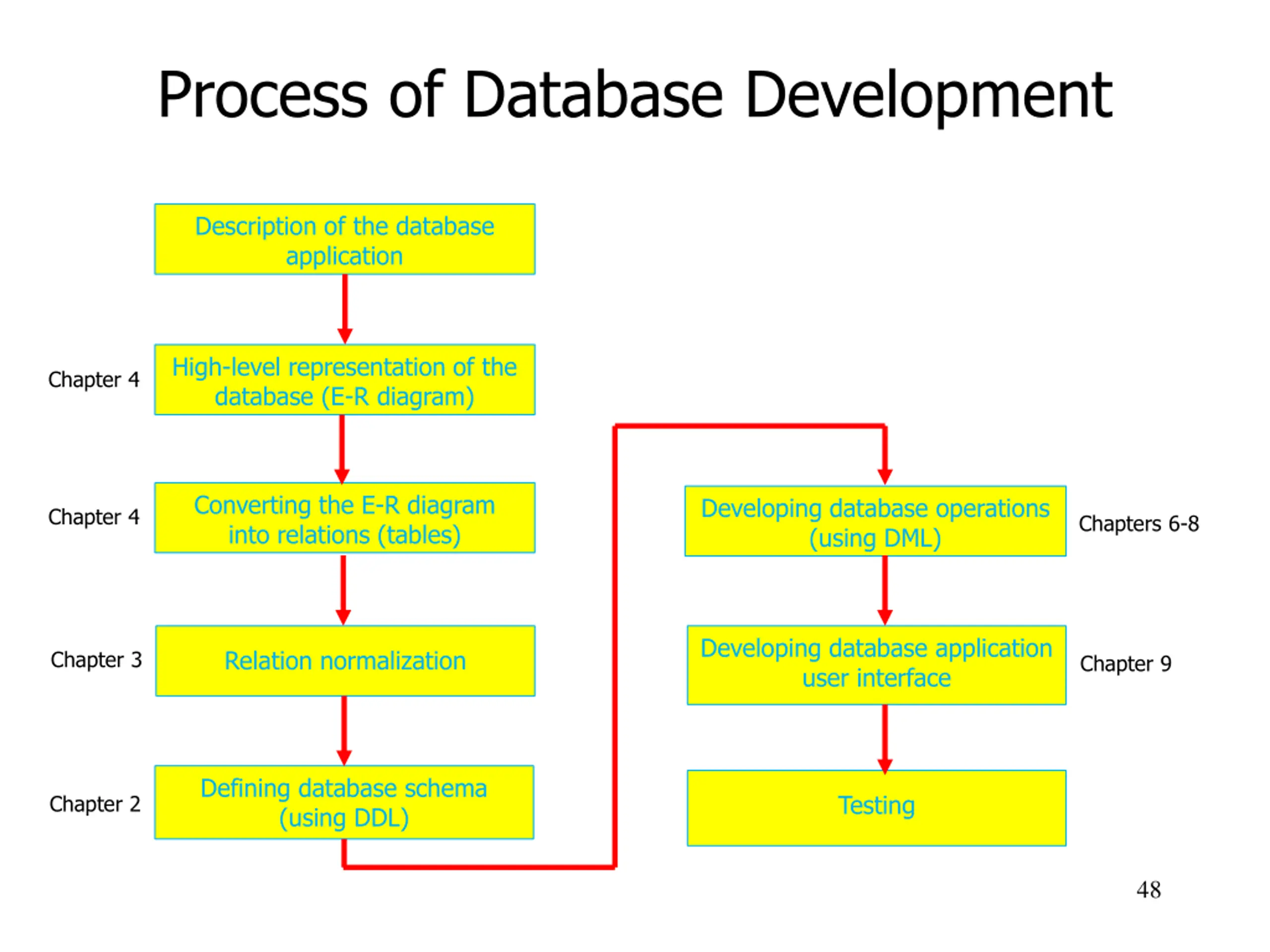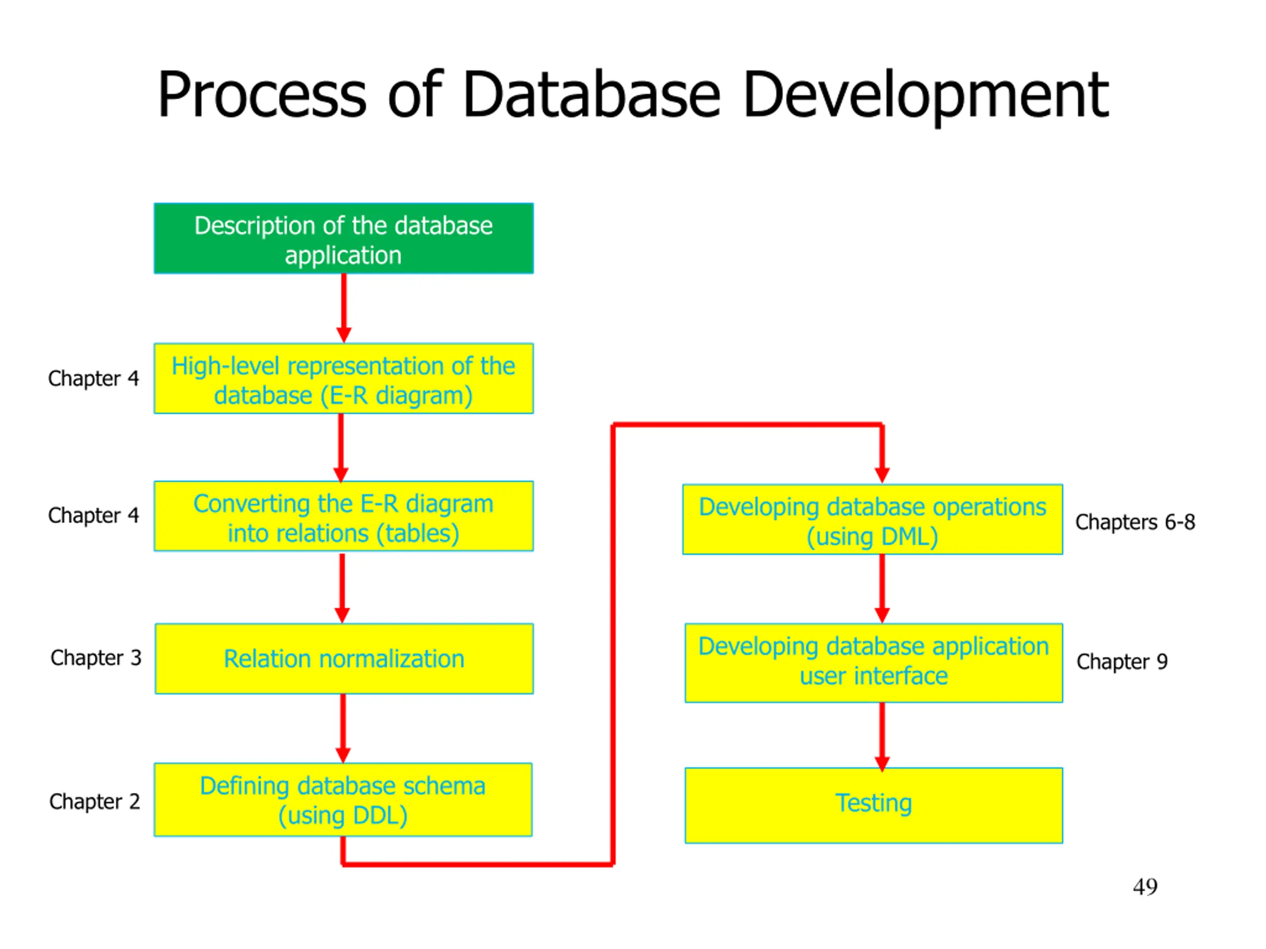 Process of Database Development Description of the database application High-level representation of the database (E-R diagram) Chapter 4 Converting the E-R diagram into relations (tables) Developing database operations (using DML) Chapter 4 Chapters 6-8 Developing database application user interface Relation normalization Chapter 3 Chapter 9 Defining database schema (using DDL) Testing Chapter 2 48