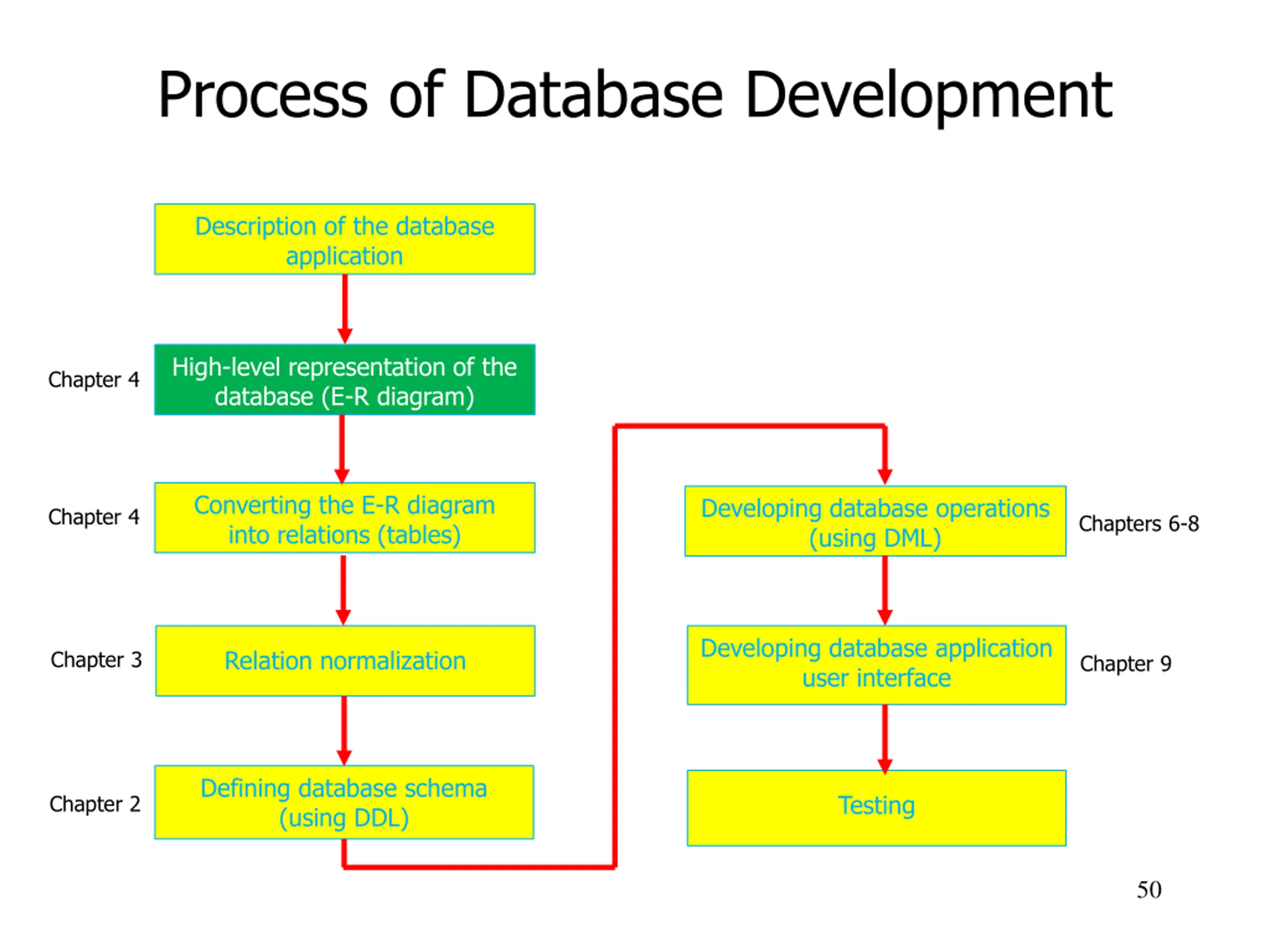 Process of Database Development Description of the database application High-level representation of the database (E-R diagram) Chapter 4 Converting the E-R diagram into relations (tables) Developing database operations (using DML) Chapter 4 Chapters 6-8 Developing database application user interface Relation normalization Chapter 3 Chapter 9 Defining database schema (using DDL) Testing Chapter 2 49