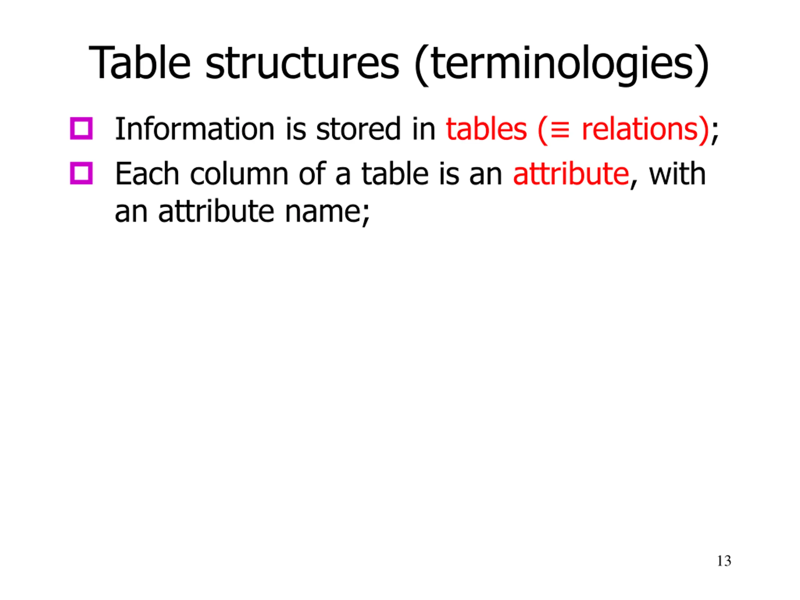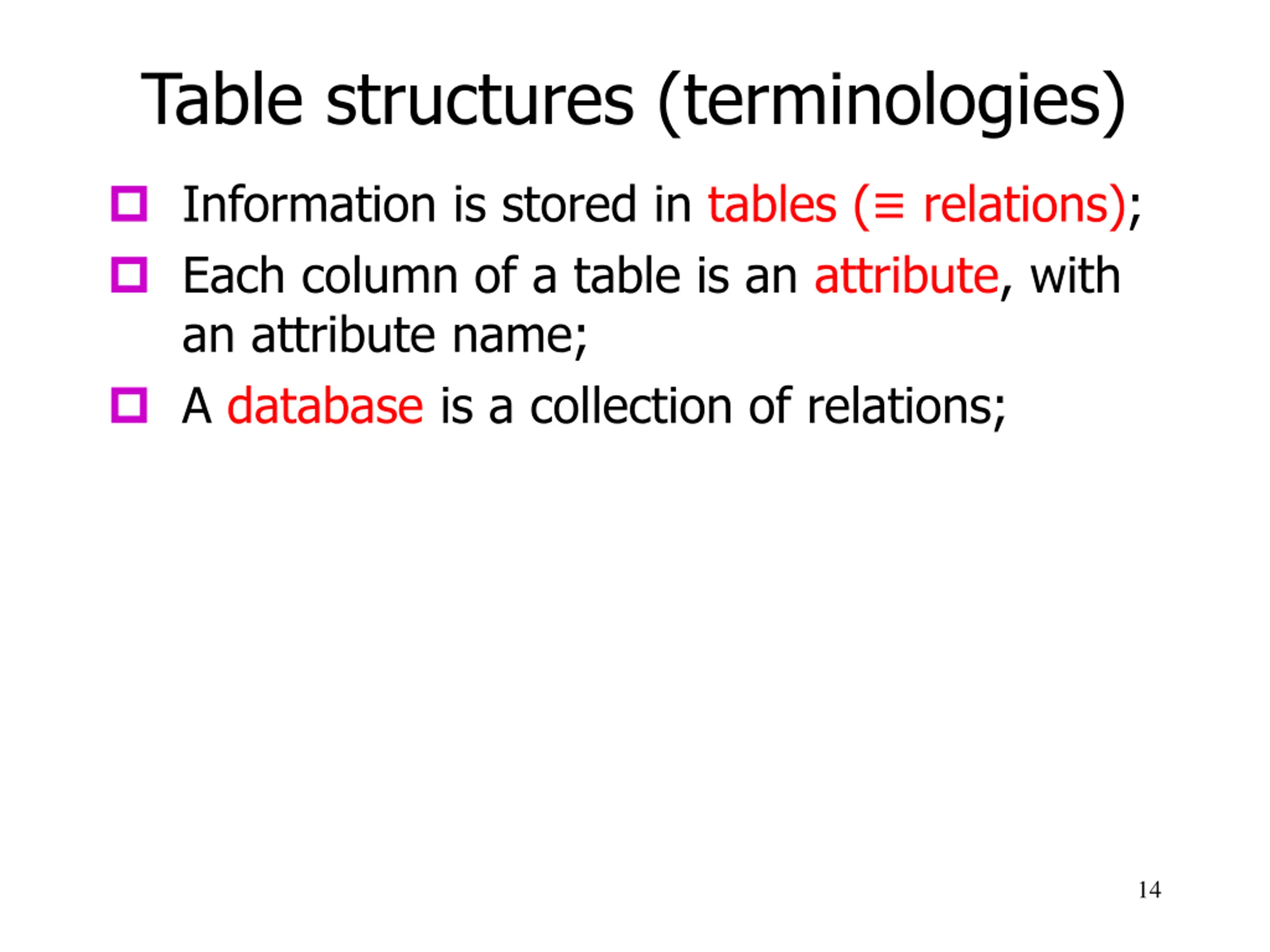 Table structures (terminologies) Information is stored in tables ( relations); Each column of a table is an attribute, with an attribute name; 13