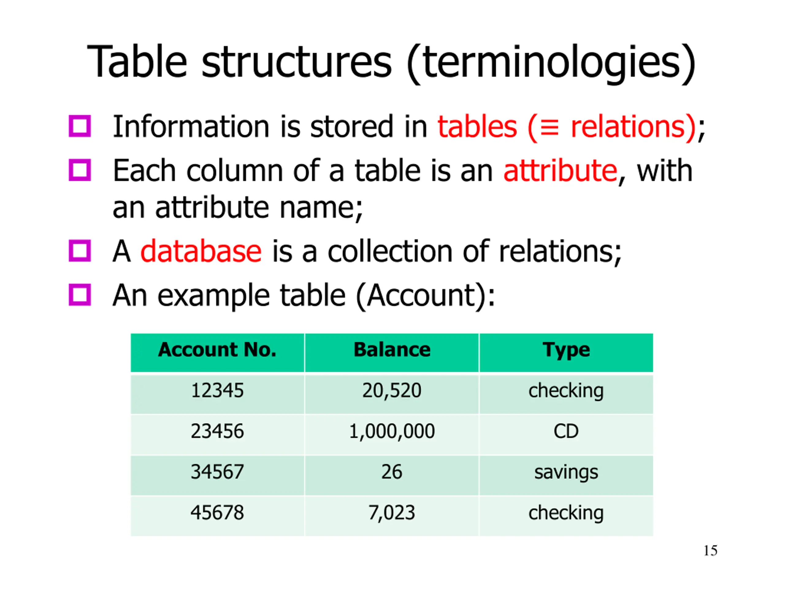 Table structures (terminologies) Information is stored in tables ( relations); Each column of a table is an attribute, with an attribute name; A database is a collection of relations; An example table (Account): Account No. Balance Type 12345 20,520 checking 23456 1,000,000 CD 34567 26 savings 45678 7,023 checking 15