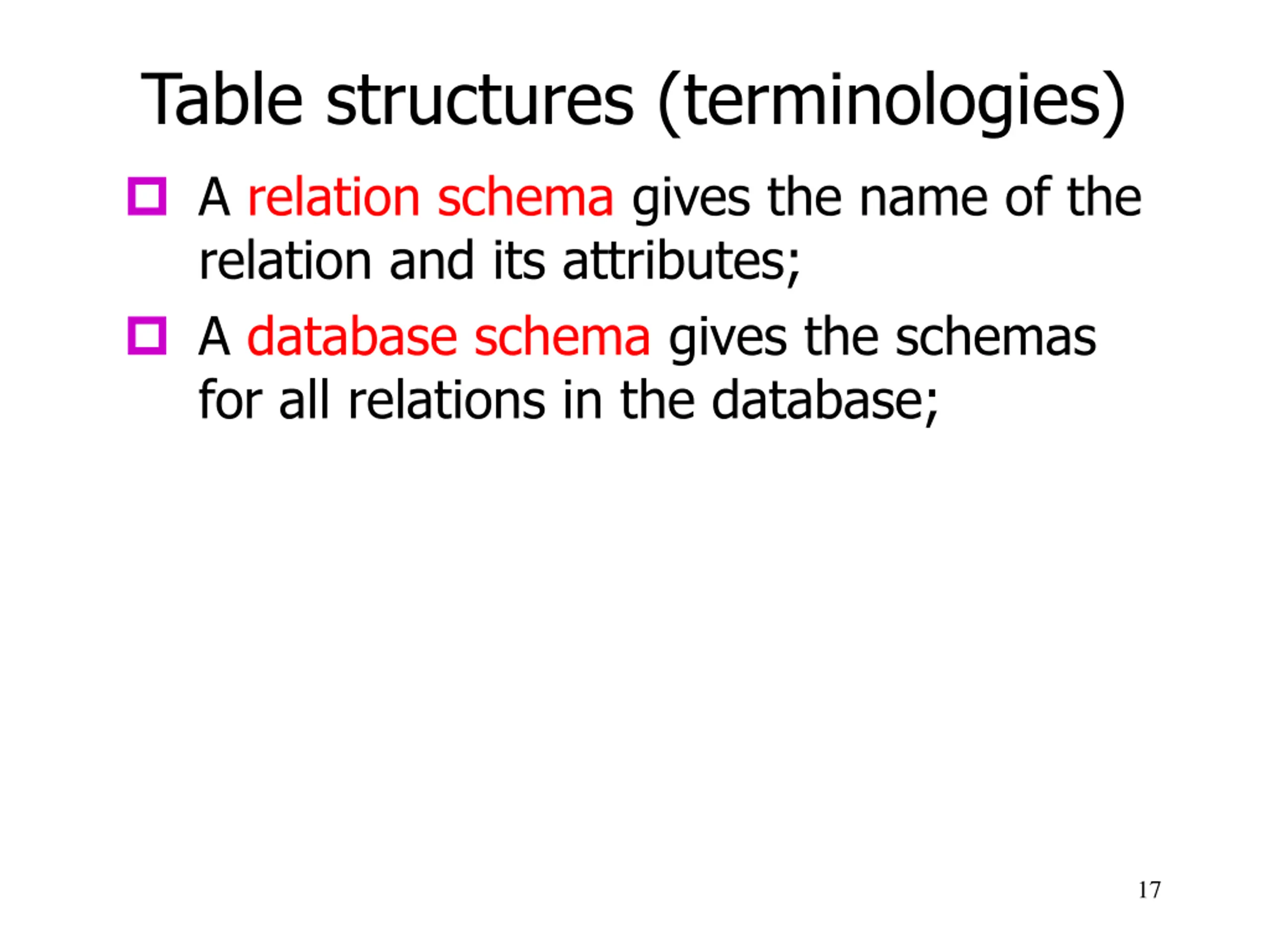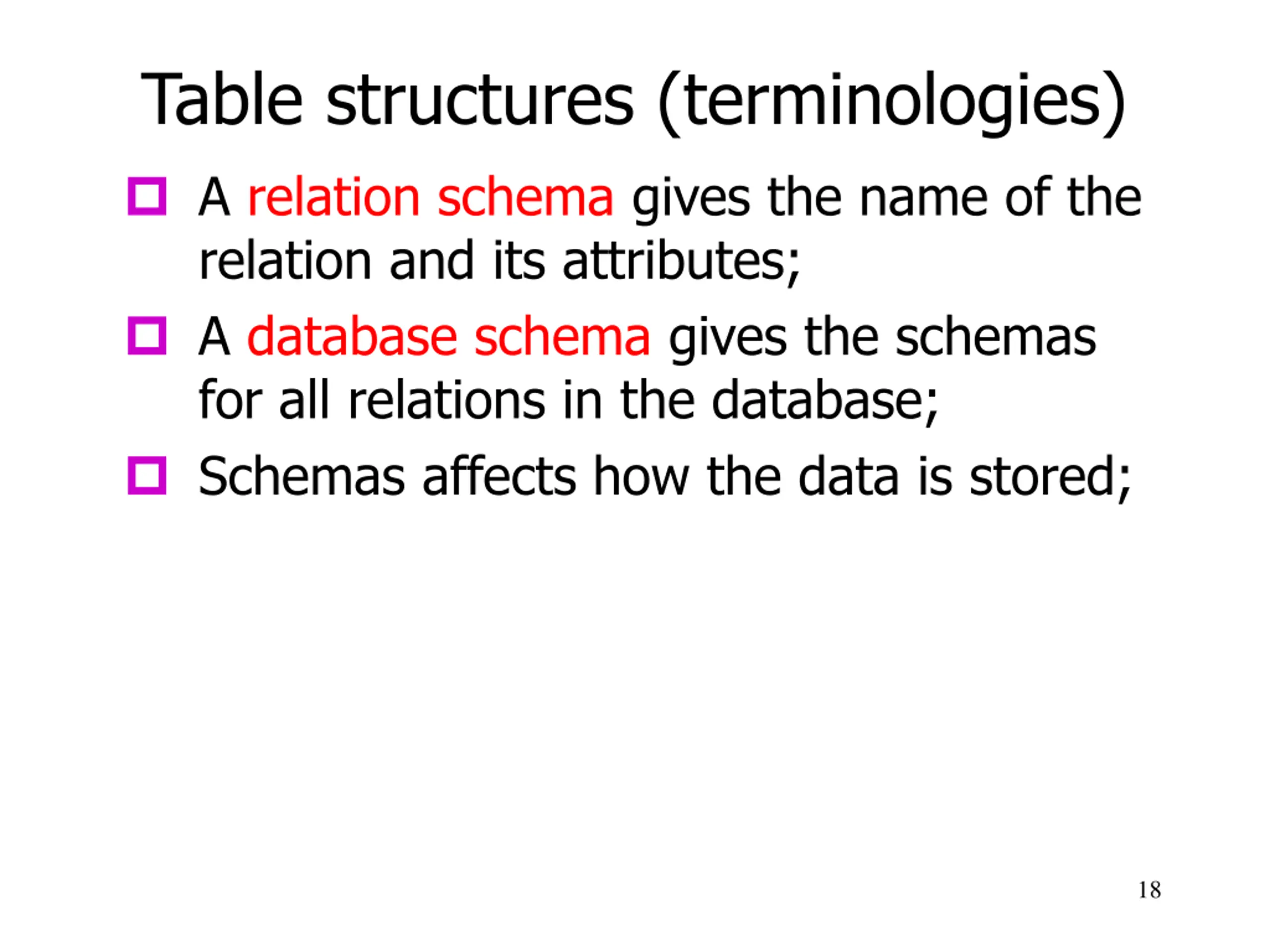 Table structures (terminologies) A relation schema gives the name of the relation and its attributes; A database schema gives the schemas for all relations in the database; 17