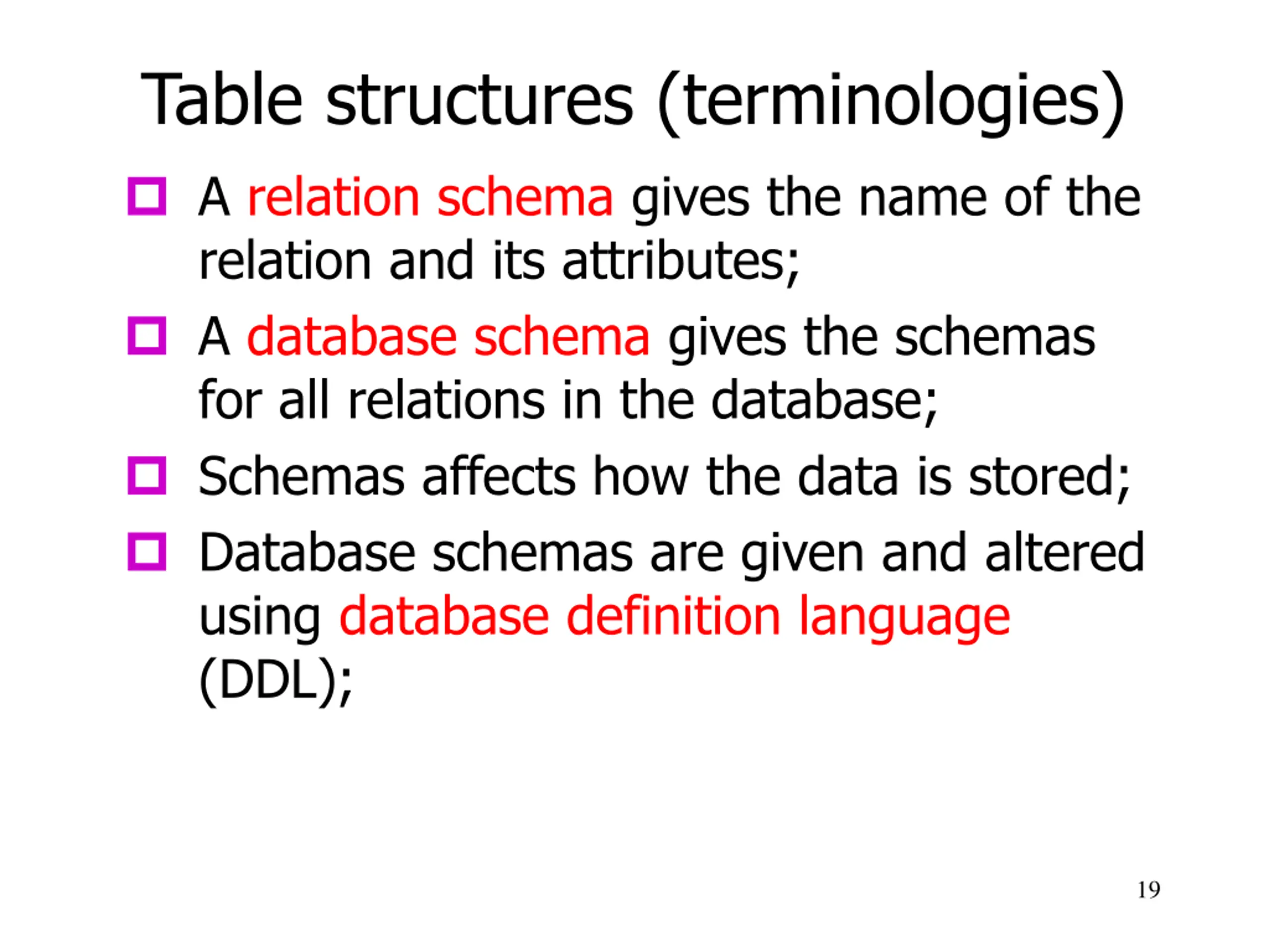 Table structures (terminologies) A relation schema gives the name of the relation and its attributes; A database schema gives the schemas for all relations in the database; Schemas affects how the data is stored; 18