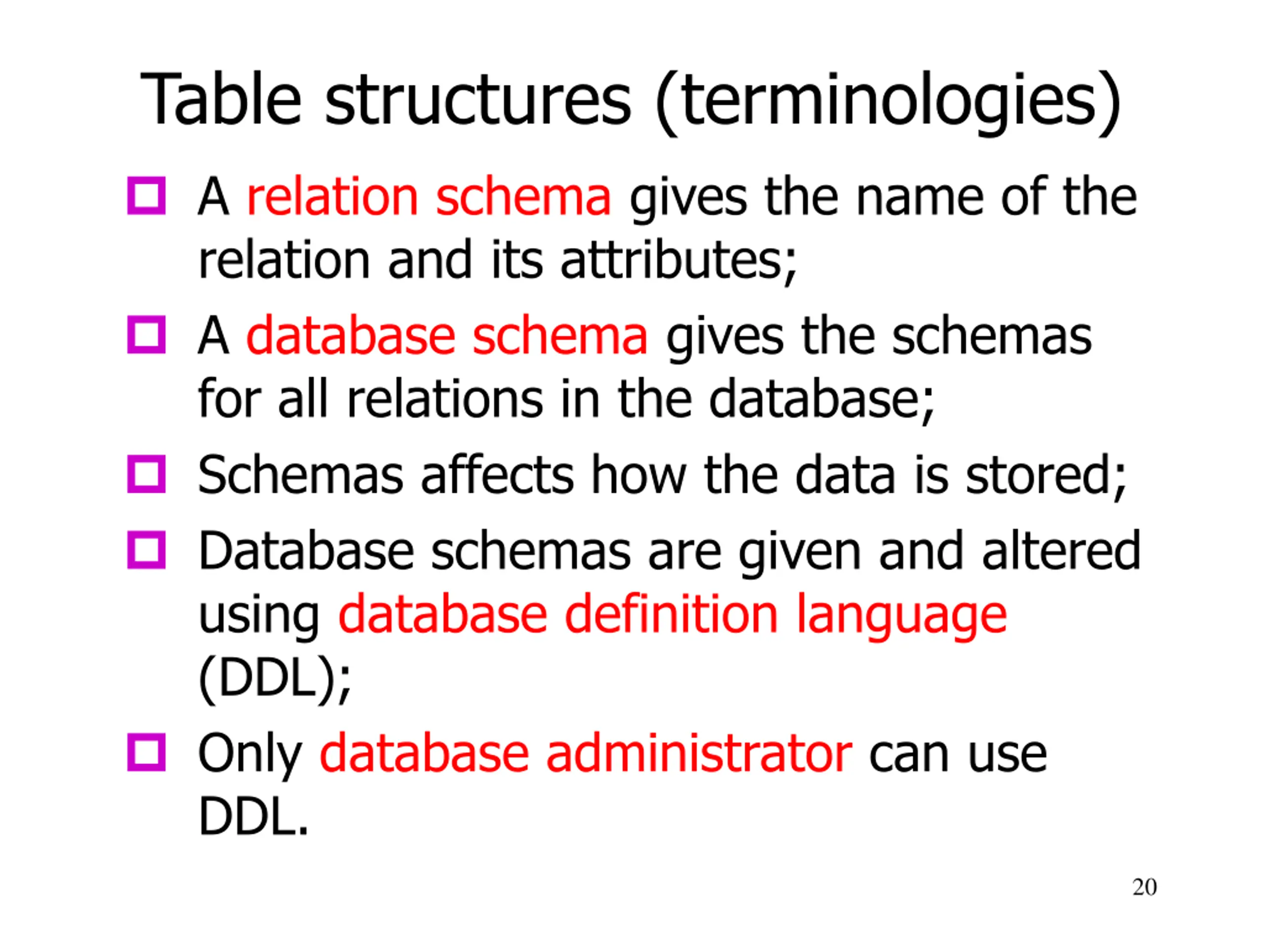 Table structures (terminologies) A relation schema gives the name of the relation and its attributes; A database schema gives the schemas for all relations in the database; Schemas affects how the data is stored; Database schemas are given and altered using database definition language (DDL); 19