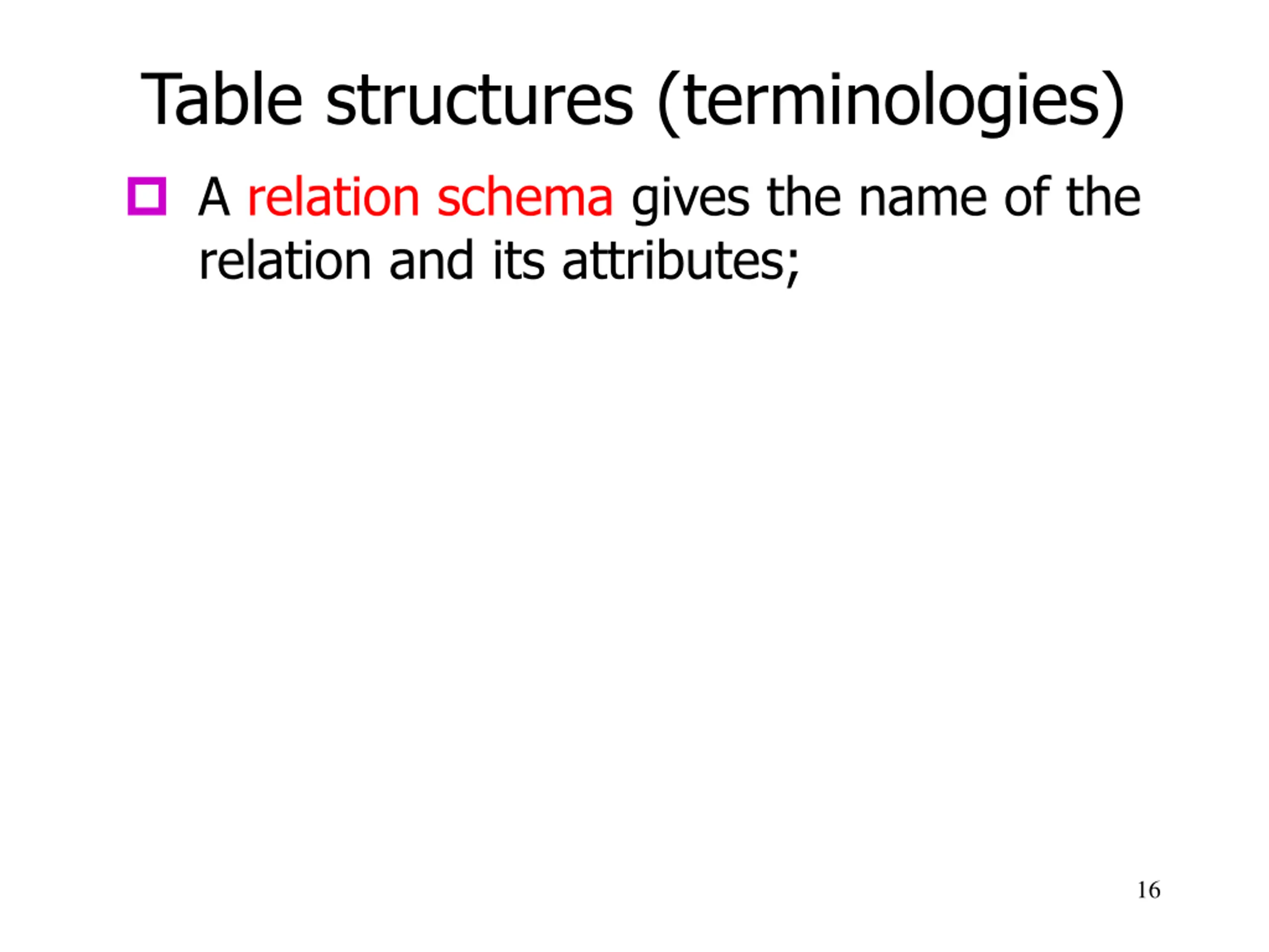 Table structures (terminologies) A relation schema gives the name of the relation and its attributes; 16