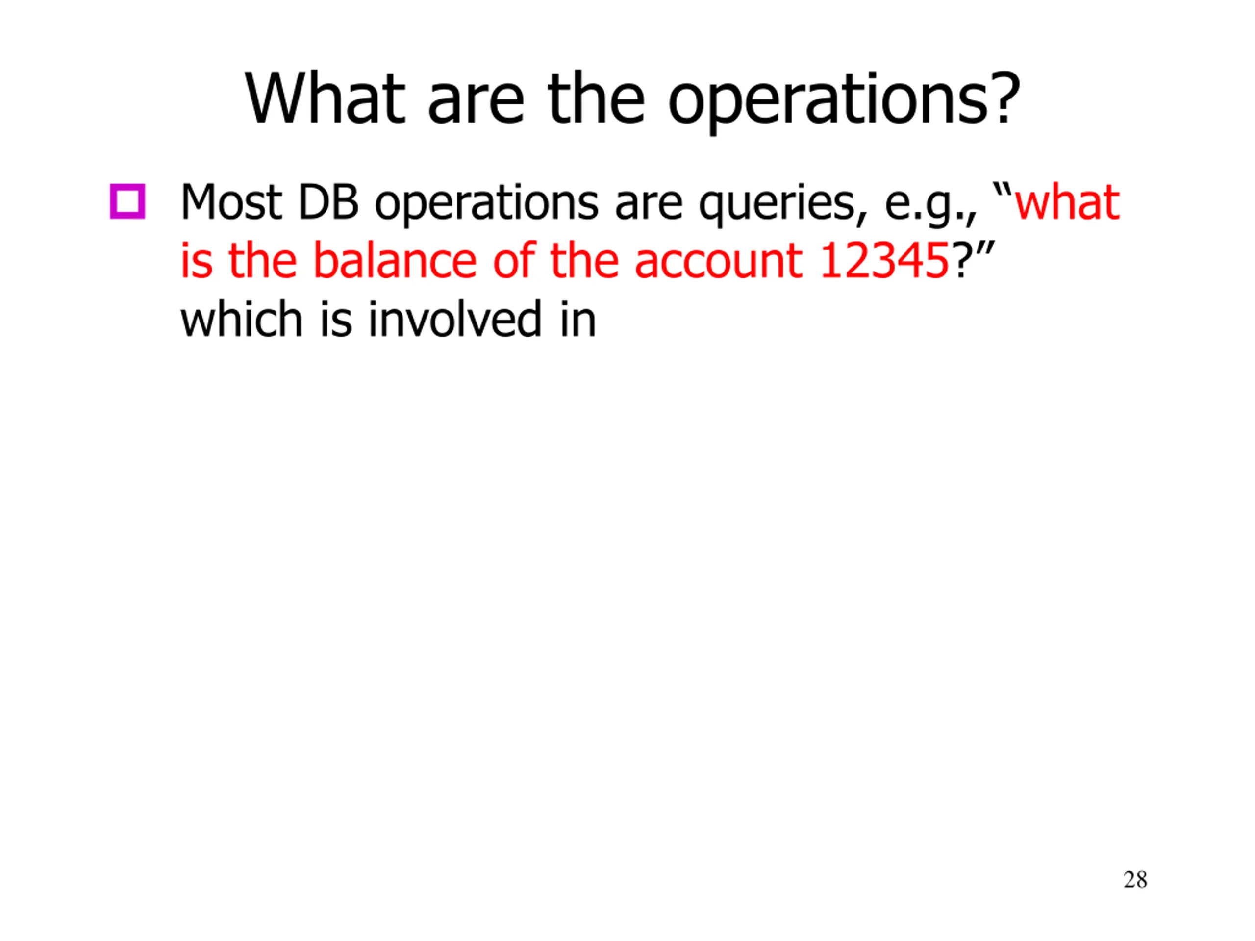 What are the operations? Most DB operations are queries, e.g., what is the balance of the account 12345? which is involved in 28