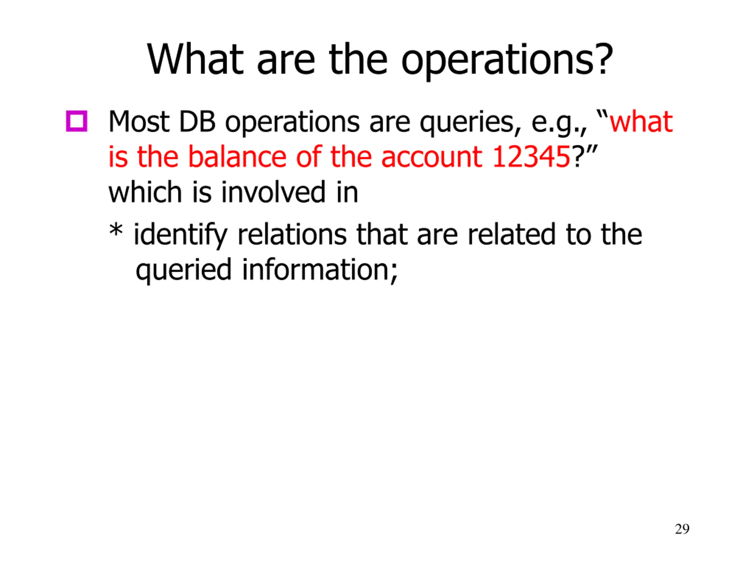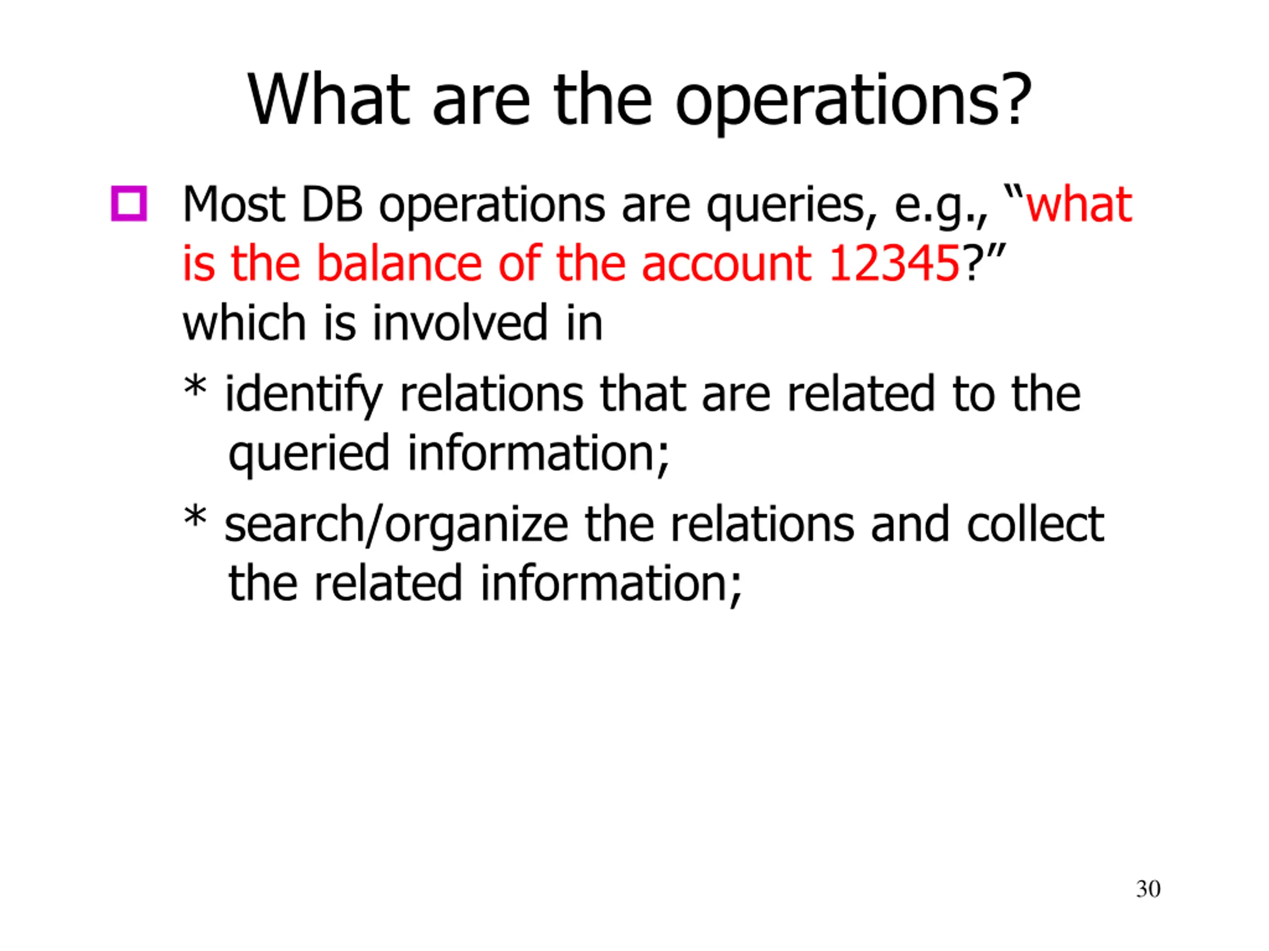 What are the operations? Most DB operations are queries, e.g., what is the balance of the account 12345? which is involved in * identify relations that are related to the queried information; 29