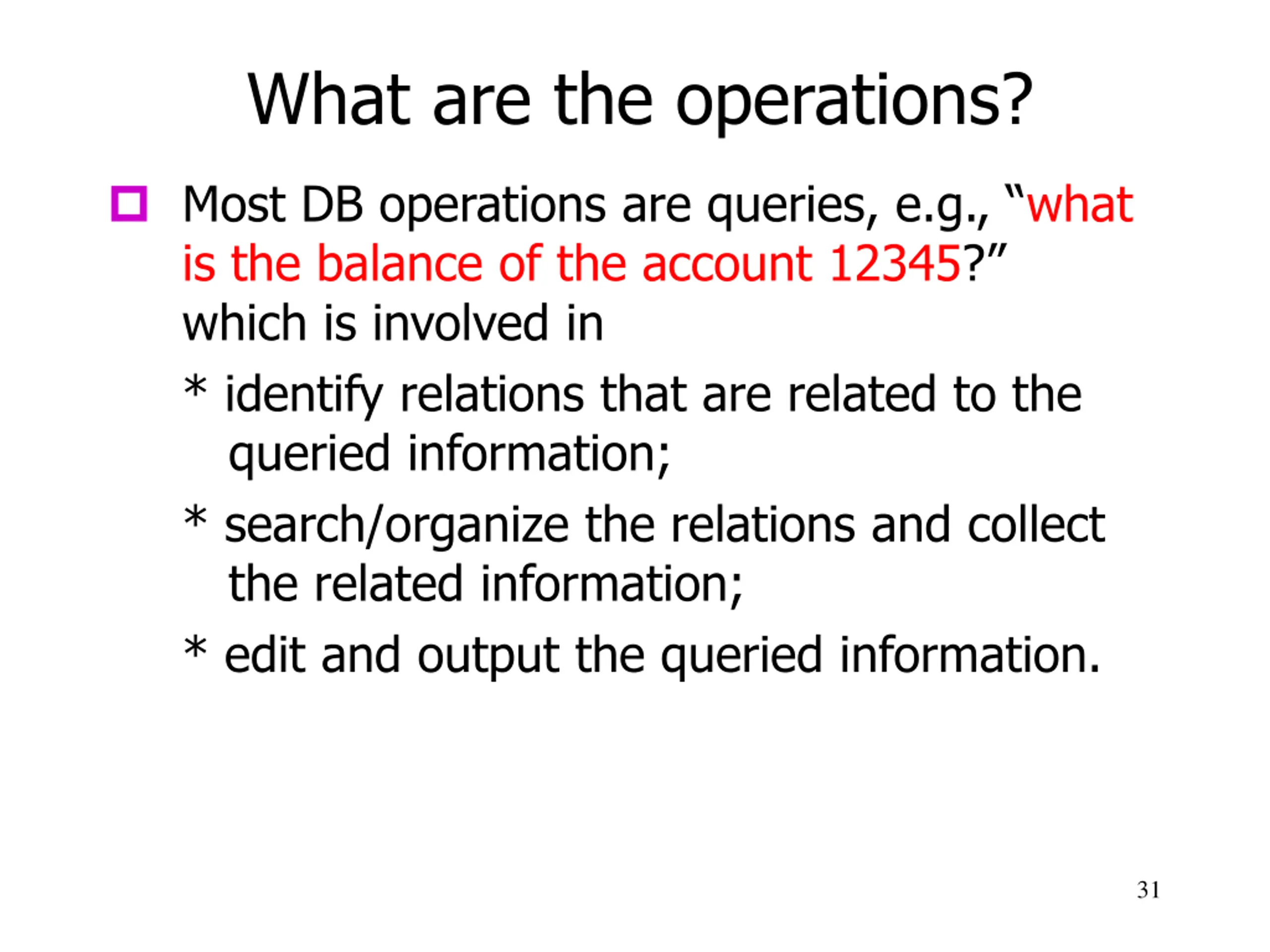 What are the operations? Most DB operations are queries, e.g., what is the balance of the account 12345? which is involved in * identify relations that are related to the queried information; * search/organize the relations and collect the related information; 30