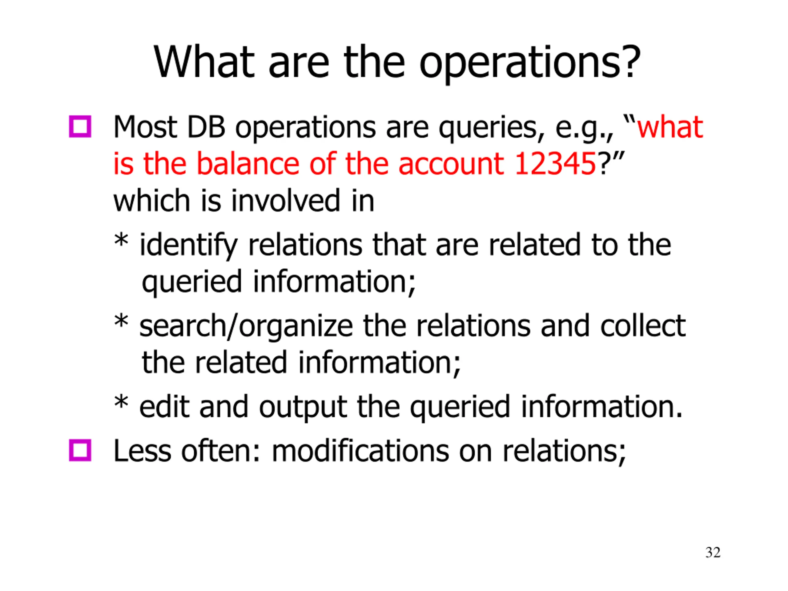 What are the operations? Most DB operations are queries, e.g., what is the balance of the account 12345? which is involved in * identify relations that are related to the queried information; * search/organize the relations and collect the related information; * edit and output the queried information. 31