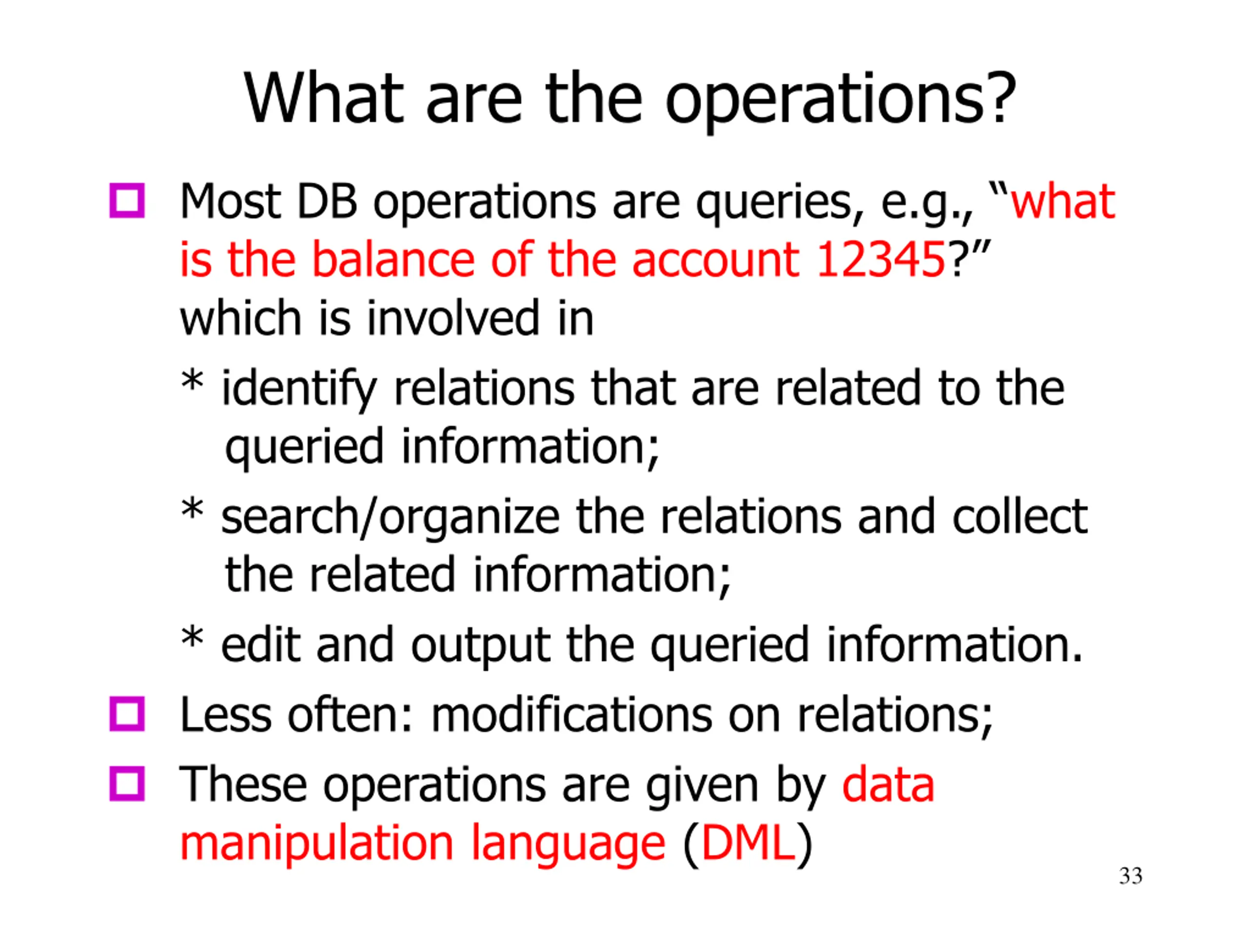 What are the operations? Most DB operations are queries, e.g., what is the balance of the account 12345? which is involved in * identify relations that are related to the queried information; * search/organize the relations and collect the related information; * edit and output the queried information. Less often: modifications on relations; 32