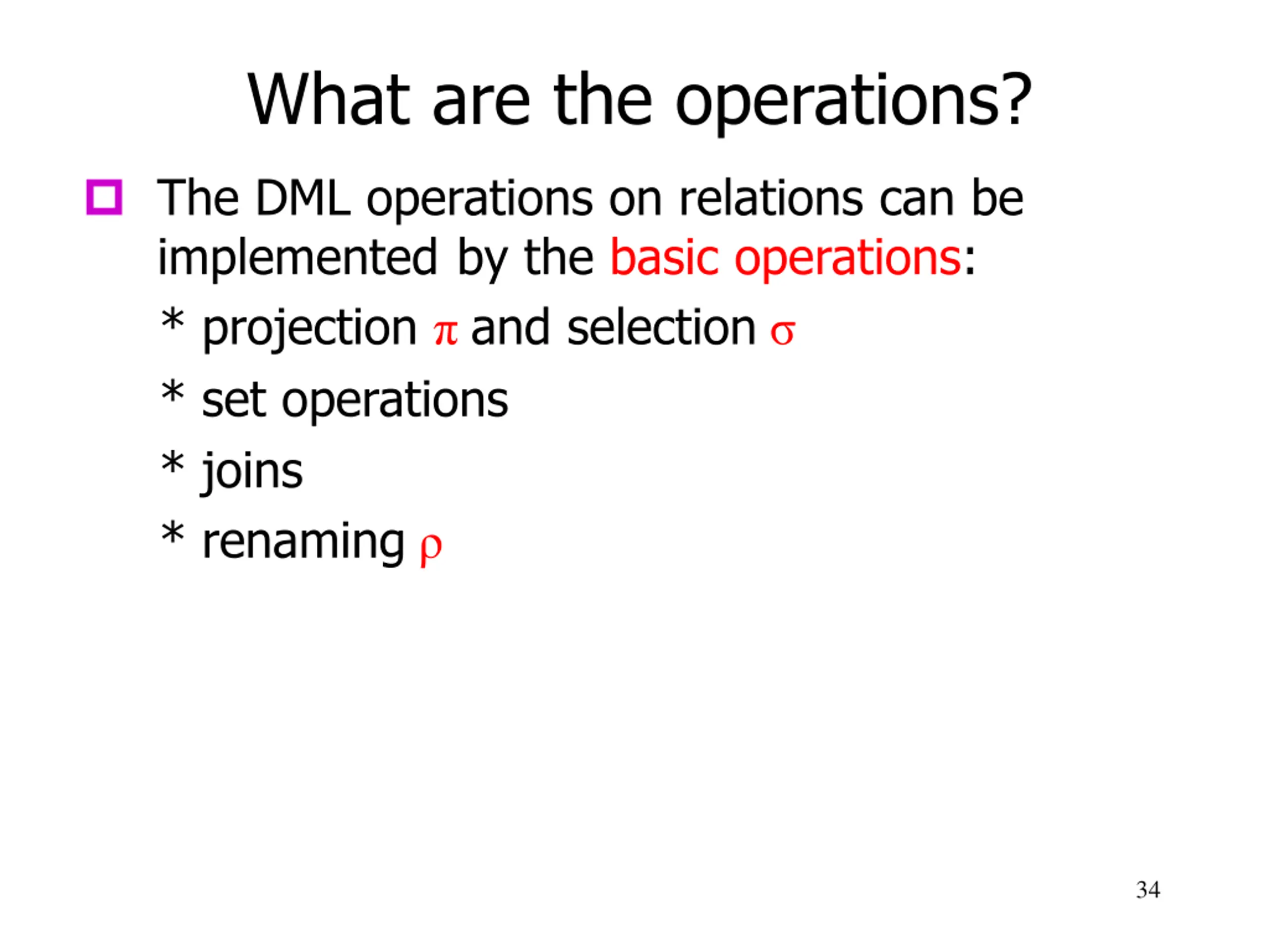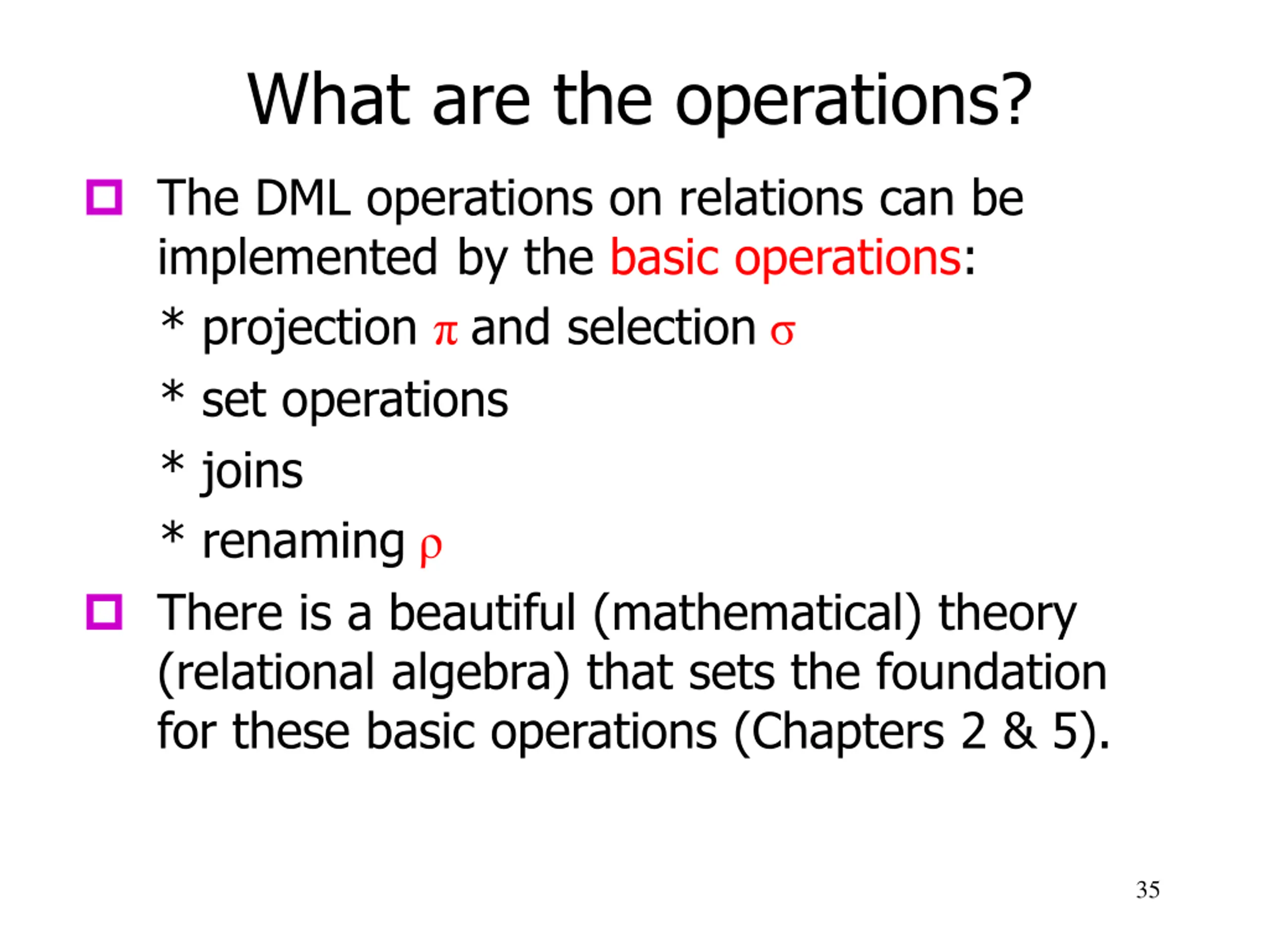 What are the operations? The DML operations on relations can be implemented by the basic operations: * projection and selection * set operations * joins * renaming 34
