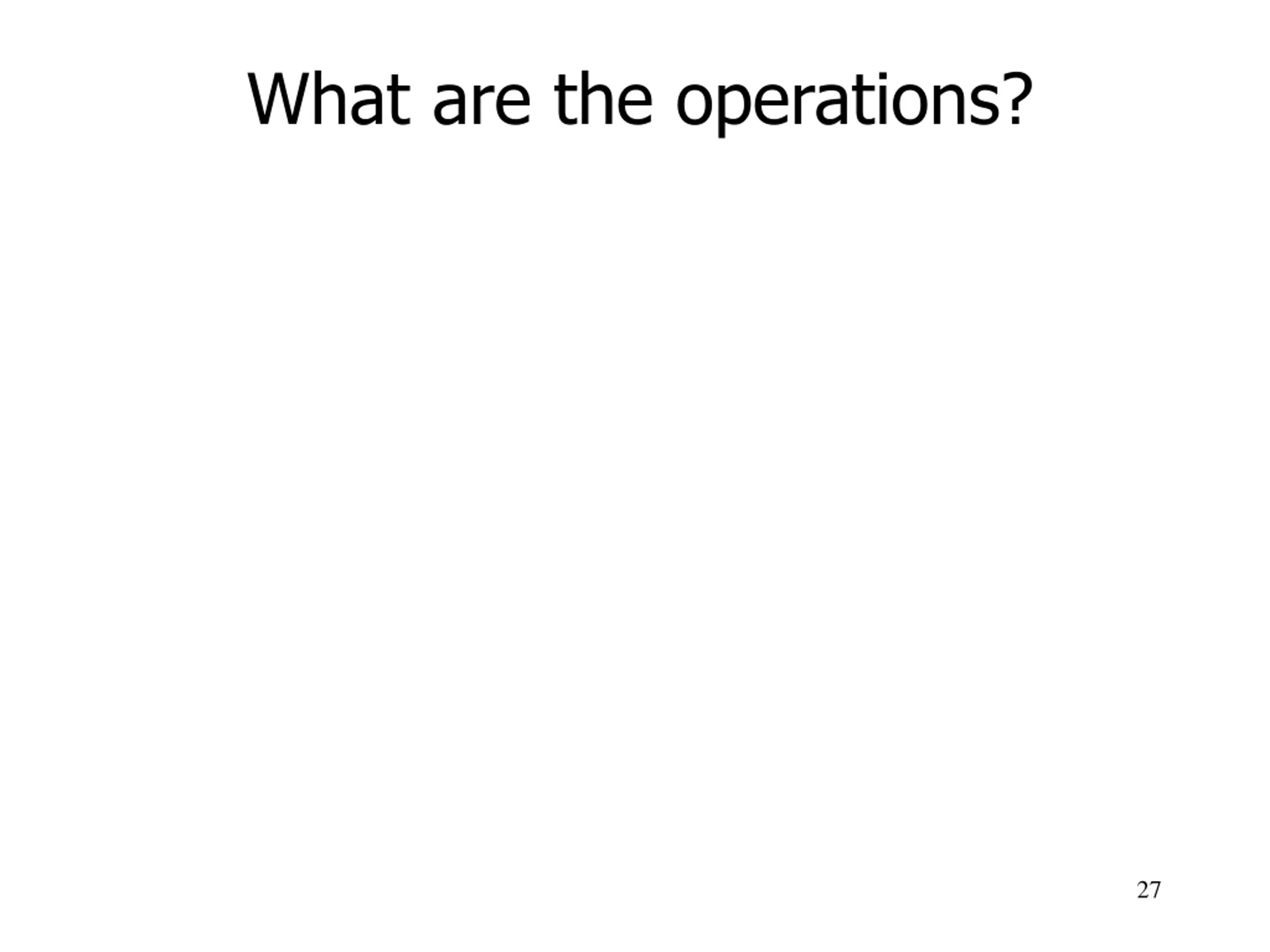 Database is just another model of information processing Then why study DB? Much more data, regular data techs would be very inefficient: How should data be stored? Operations are simpler & more specific: How do we take advantage of it? New programming languages for the above. (ACID) Reliability, security, consistency, currency , , , set ops, joins Data (in disks) SQL 26