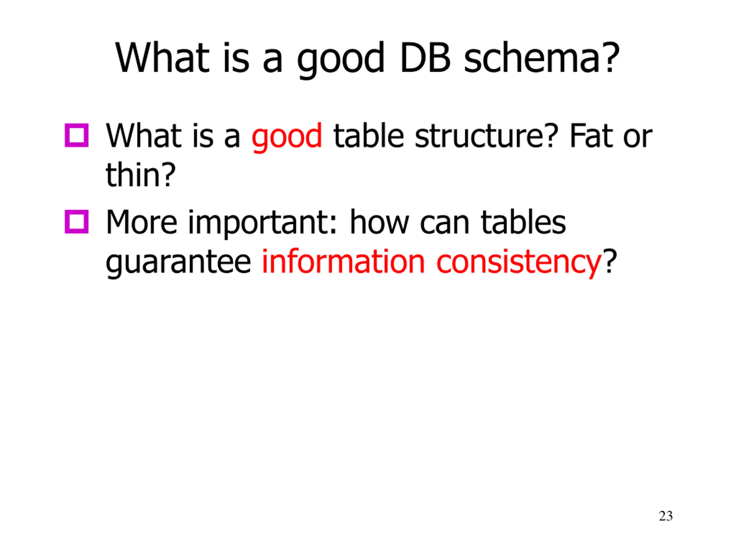 What is a good DB schema? What is a good table structure? Fat or thin? More important: how can tables guarantee information consistency? 23