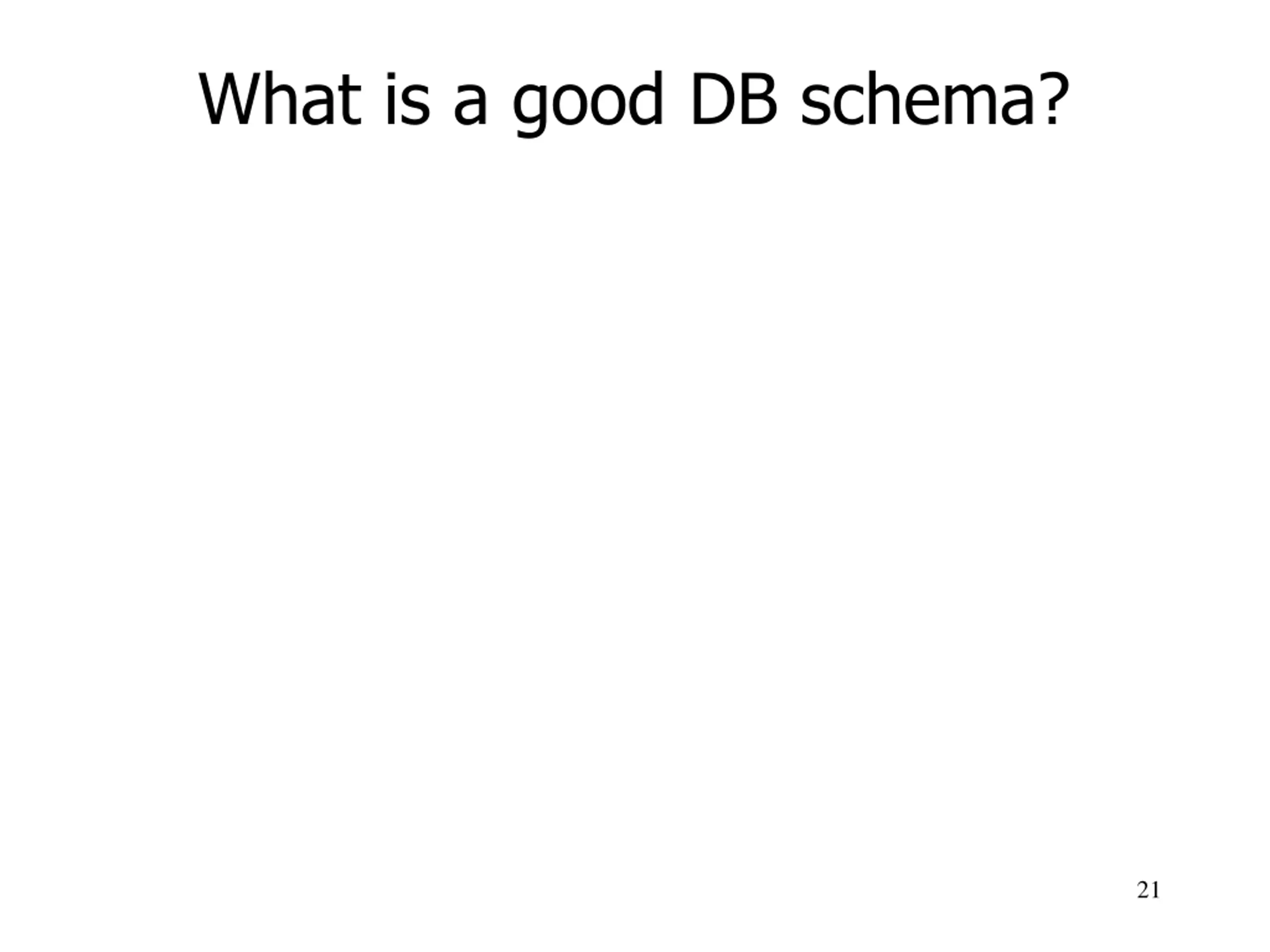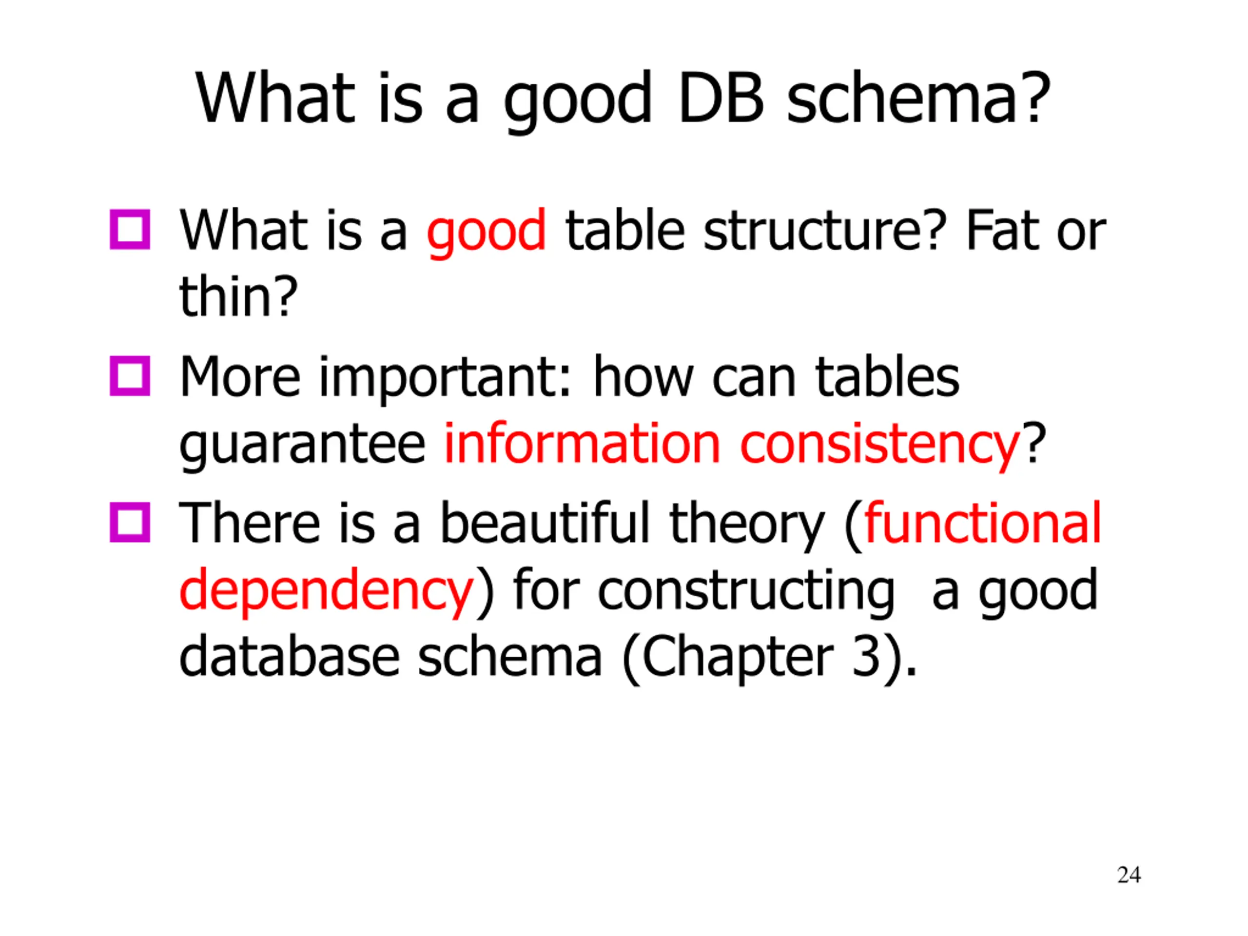 What is a good DB schema? What is a good table structure? Fat or thin? More important: how can tables guarantee information consistency? There is a beautiful theory (functional dependency) for constructing a good database schema (Chapter 3). 24