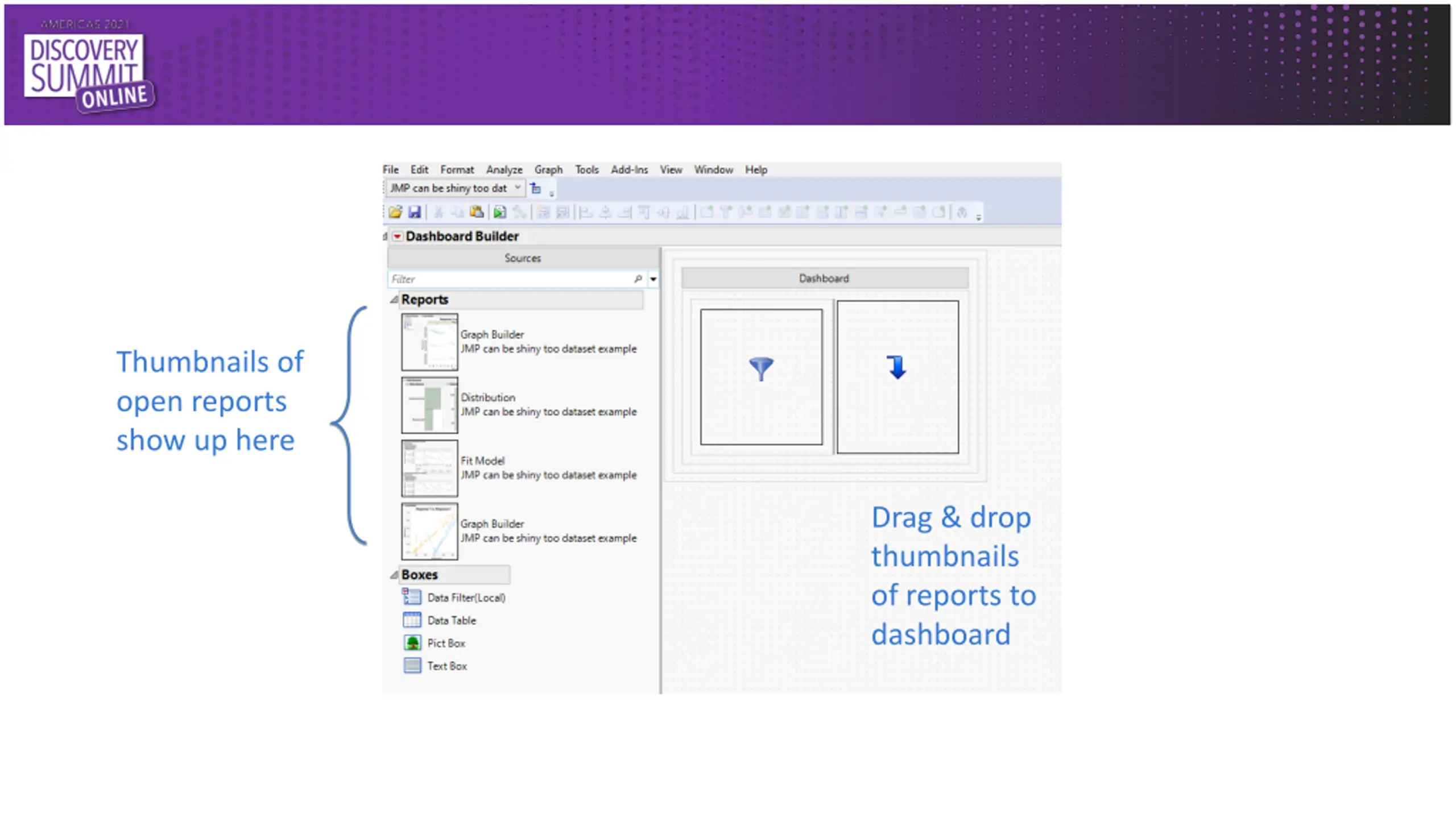 Thumbnails of open reports show up here Drag & drop thumbnails of reports to dashboard