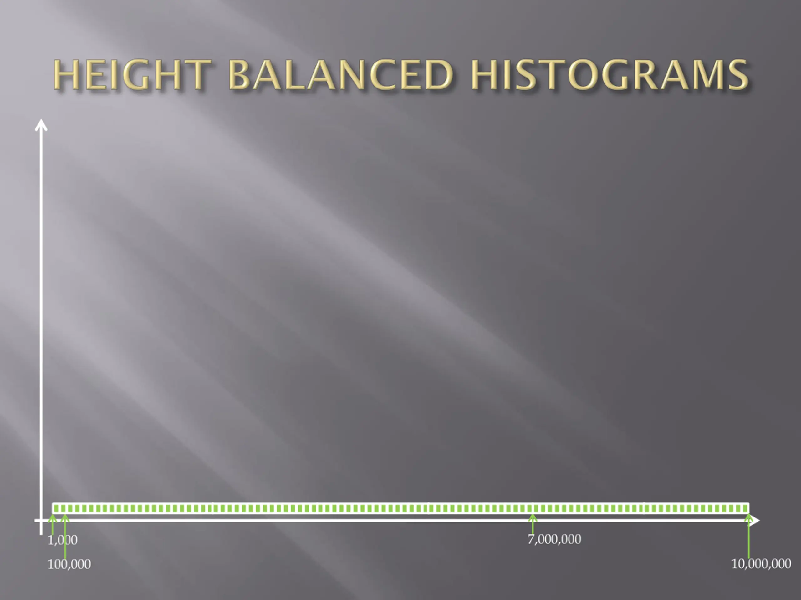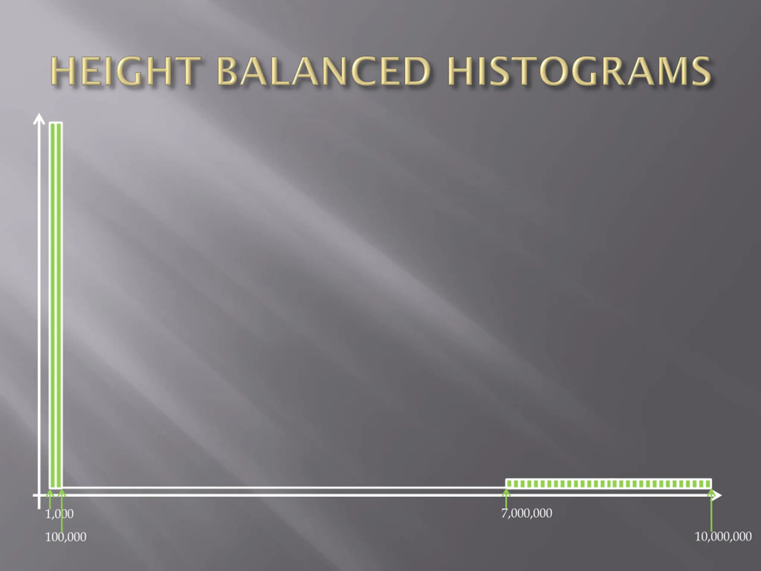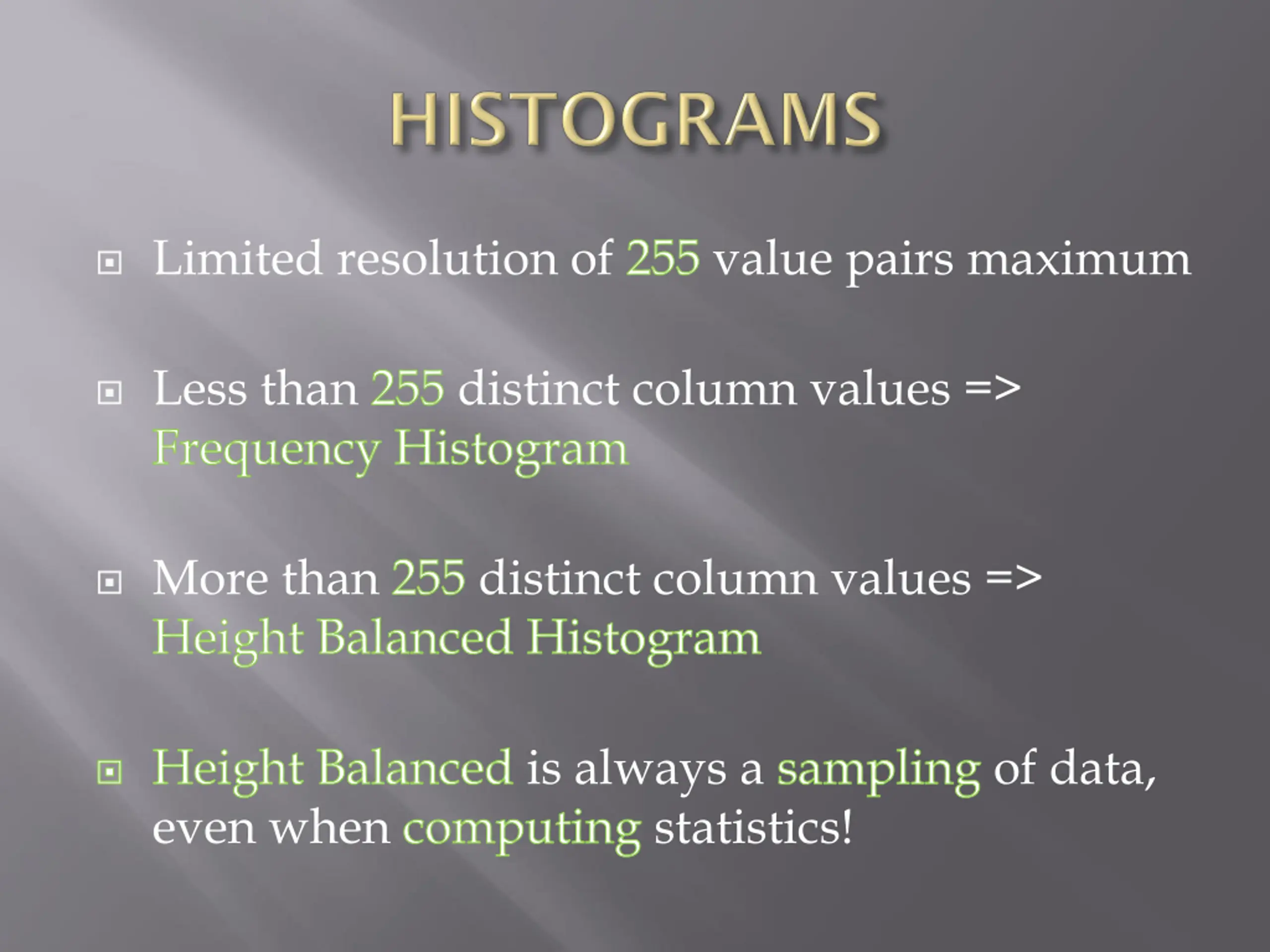 Limited resolution of 255 value pairs maximum Less than 255 distinct column values => Frequency Histogram More than 255 distinct column values => Height Balanced Histogram Height Balanced is always a sampling of data, even when computing statistics!